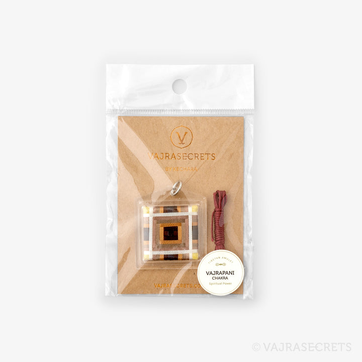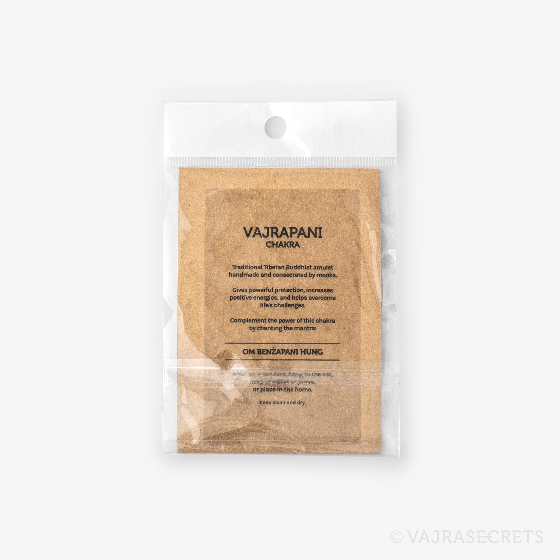 A traditional Tibetan Buddhist amulet containing the essence, power and wish-fulfilling energies of Vajrapani, the Buddha of Spiritual Power. Handmade and consecrated by monks, the Vajrapani chakra is especially effective for helping us develop skilful means and wisdom to pacify inner and outer obstacles. It also bestows powerful protection, increases positive energies, and helps overcome life's challenges.