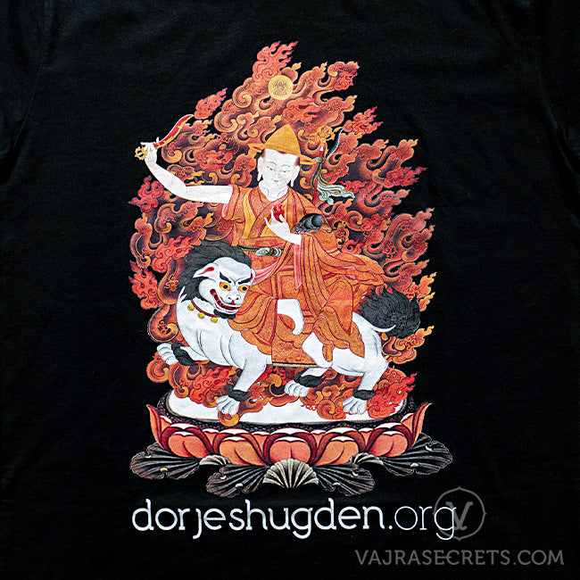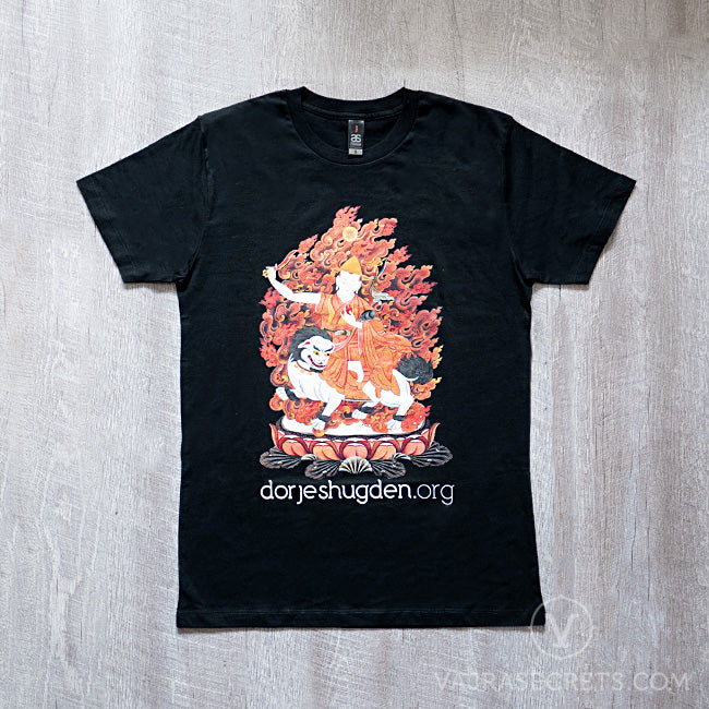 A high-quality printed men's crew neck t-shirt featuring the peaceful form of Dharma Protector Dorje Shugden in the front, who brings success, harmony and peace to all who invoke his blessings. The back is printed with his powerful mantra OM BENZA WIKI BITANA SOHA.