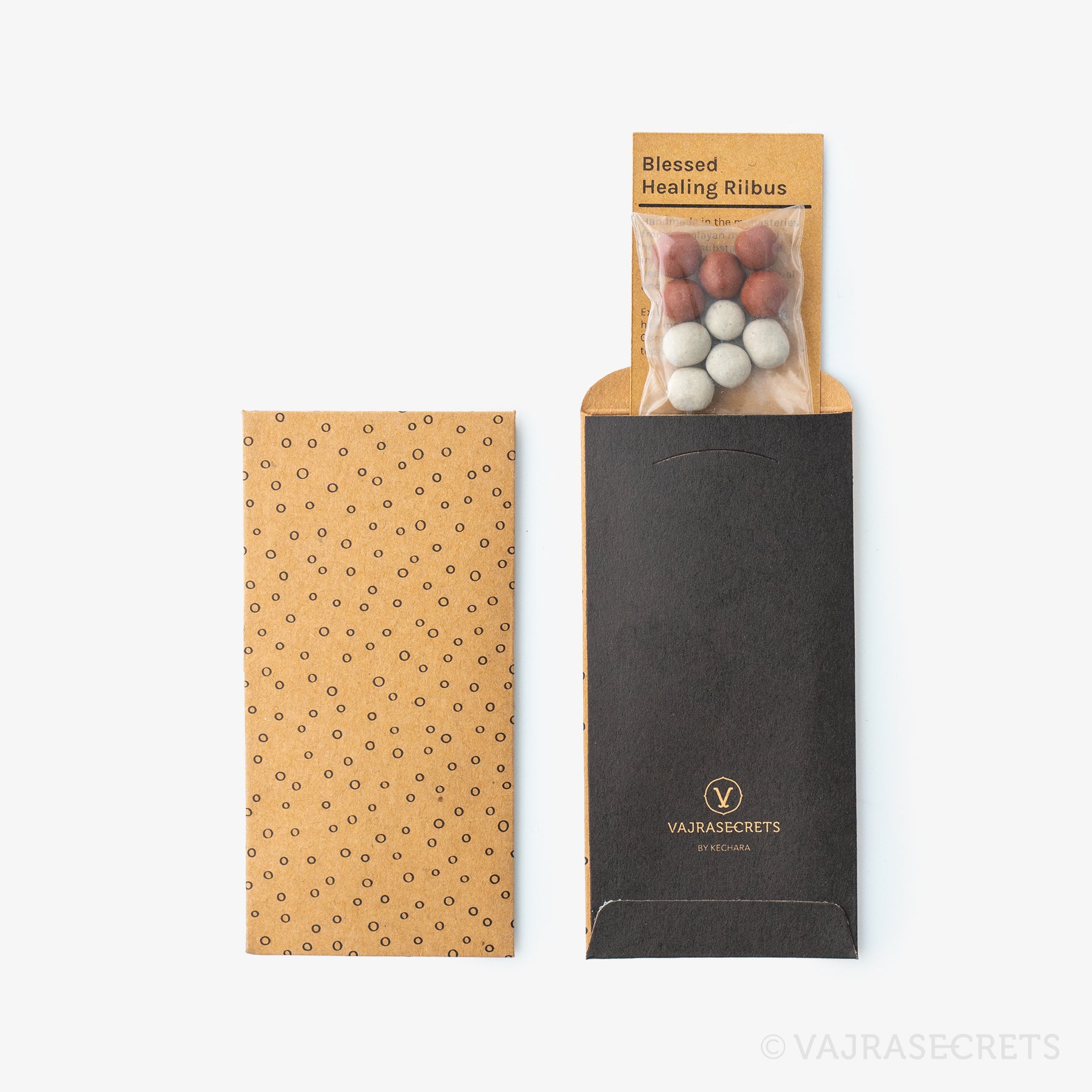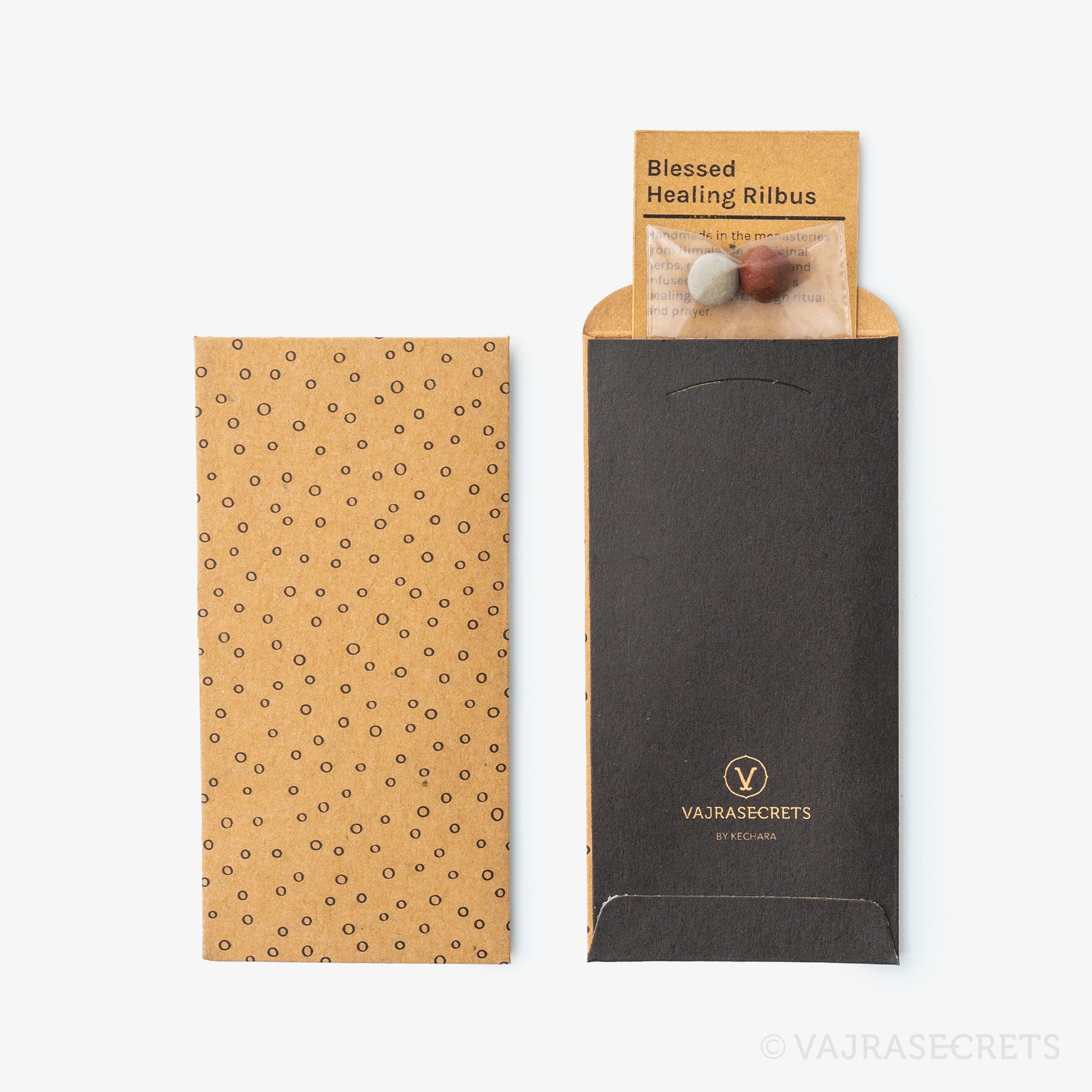 Handmade by high lamas and monks with natural medicinal herbs from the Himalayan mountains, and infused with healing powers through ritual and prayer, these incredible holy rilbus are blessed with tremendous healing properties. Applied topically, these blessed rilbus hasten the healing and recovery process for those in need.