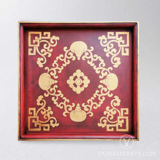 A sturdy Tibetan-style tray crafted from Himalayan hardwood and hand-painted in traditional colours with gold motifs. The design features a double vajra in the centre surrounded by four conch shells and other Tibetan-inspired elements at the corners.