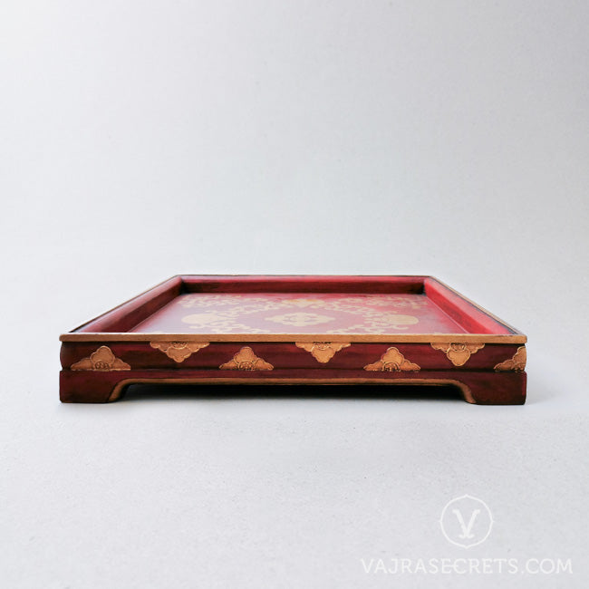 A Tibetan-style tray handcrafted from Himalayan hardwood and painted in traditional colours with gold motifs. Suitable for making offerings of fruits or food on your altar or to hold your ritual items during prayers.