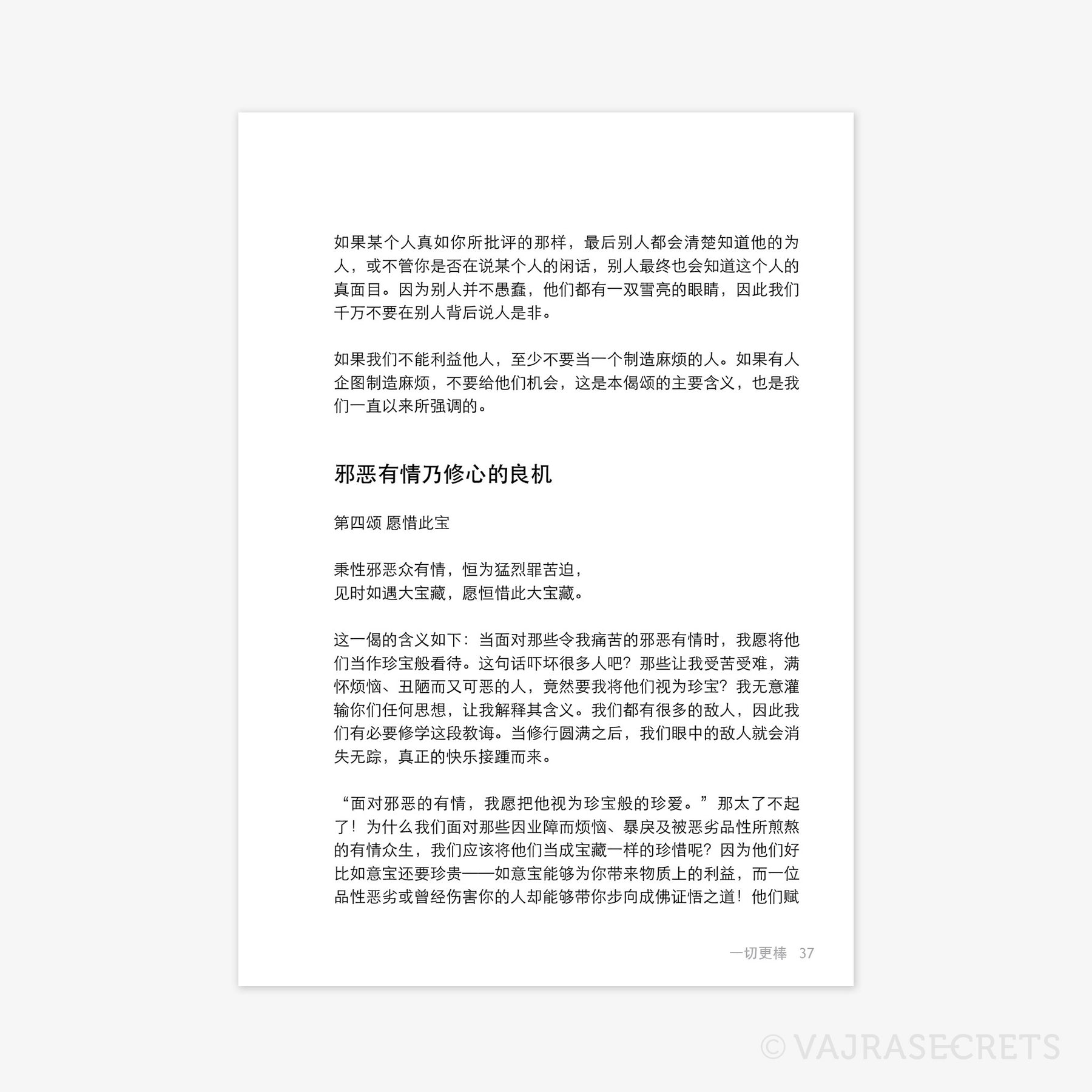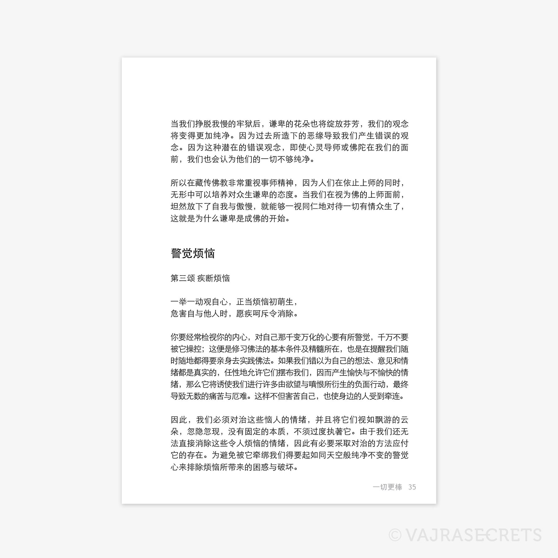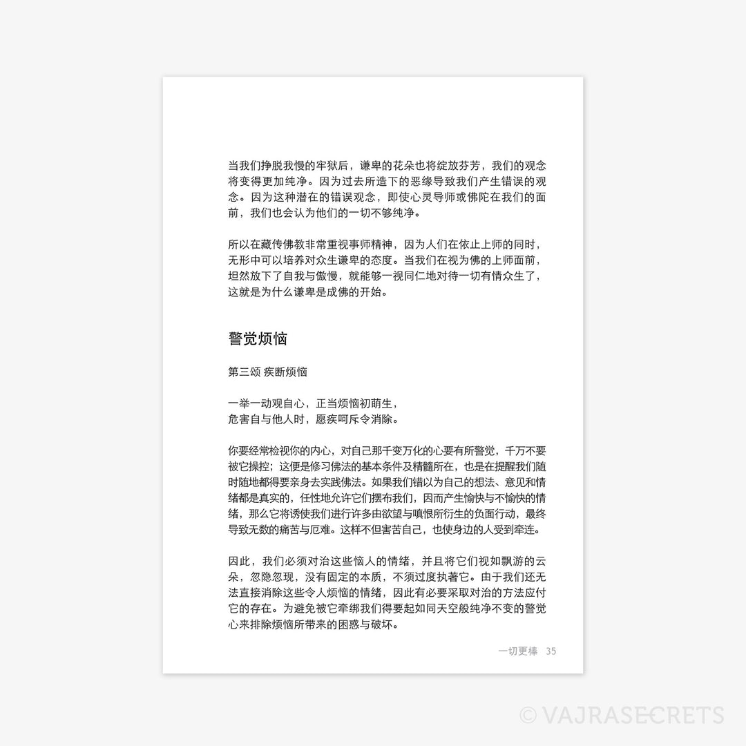 《一切更棒》(第二版) 收集了尊贵的詹仁波切近年来的五个开示,课题内容以慈悲、心识为主。仁波切得开始皆取自格鲁巴创始人宗喀巴大师之著名论着《菩提道次第广论》中的精髓,并且将之简化,再以他善巧的智慧,串集成轻松活泼,贴近生活的文字,让大家能够从简易的开示中,获得佛法美妙的福泽。