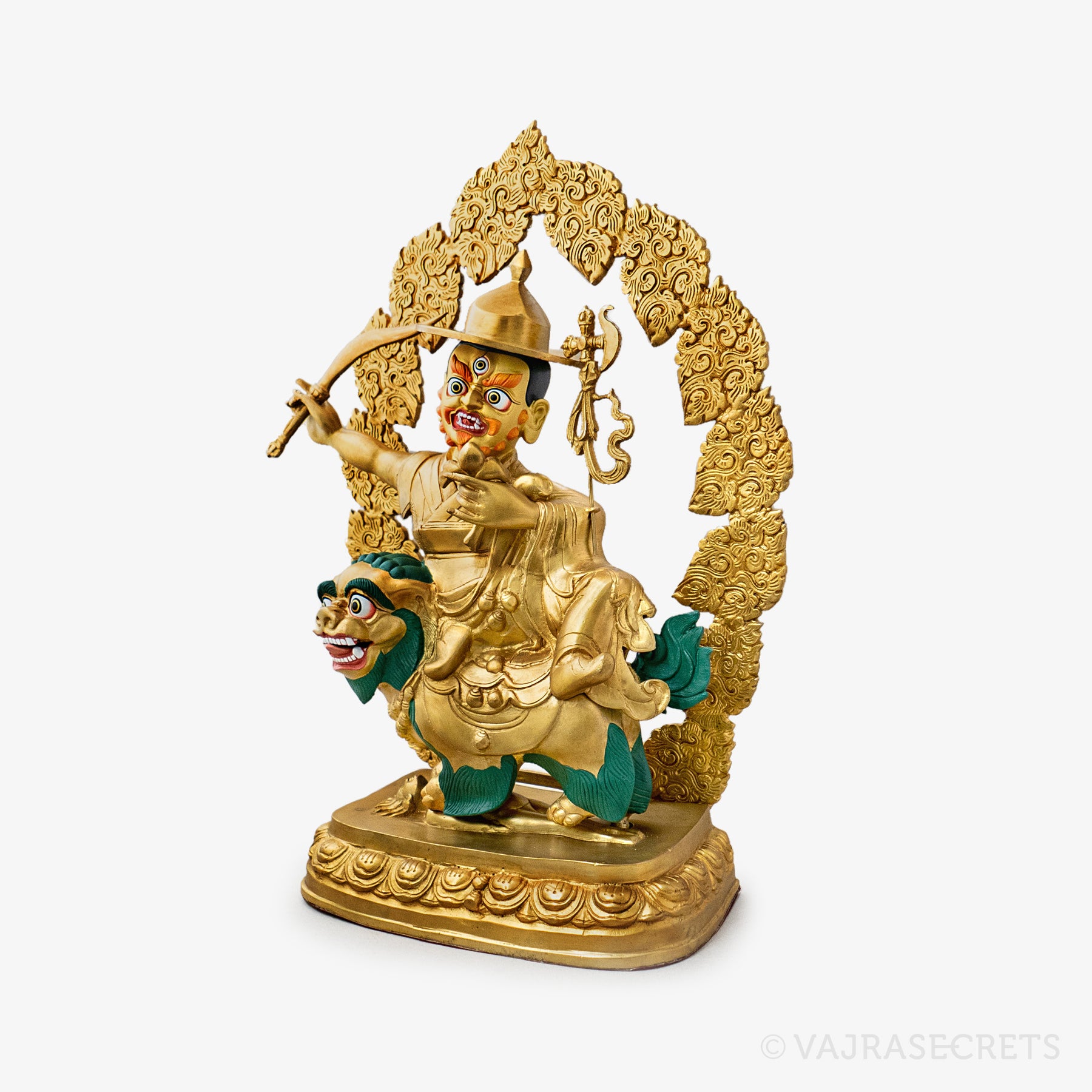 A brass statue of the Dharma Protector Dorje Shugden in wrathful form, hand-painted gold face, wrathful deity features and traditional insertion with mantras and holy items. Fierce yet compassionate, he grants powerful protection from negative energies and black magic, swiftly helps overcome life’s obstacles, and attracts the positive energies of wealth, peace and wisdom.