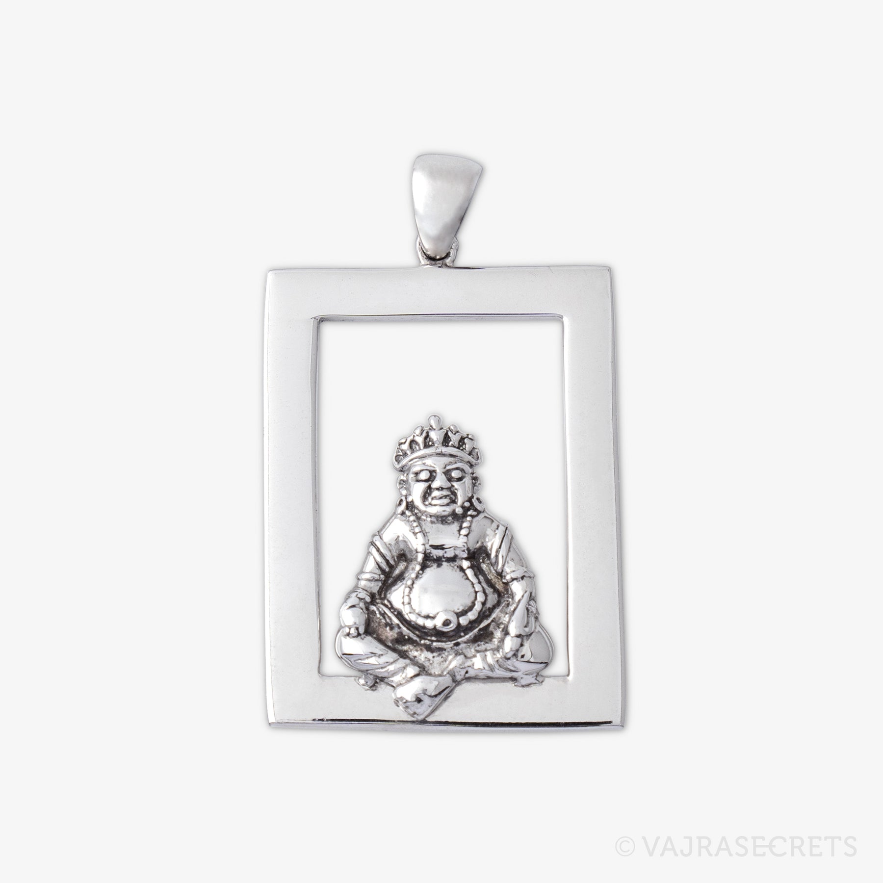 A white gold-plated Buddha Dzambala mounted on a hollow rectangular frame. From one of The Emptiness Collection, this pendant combines understated elegance with everyday wearability. Wear him close to your heart and be blessed with spiritual wealth and overcome emotional poverty: miserliness, greed and the inability to give or share.