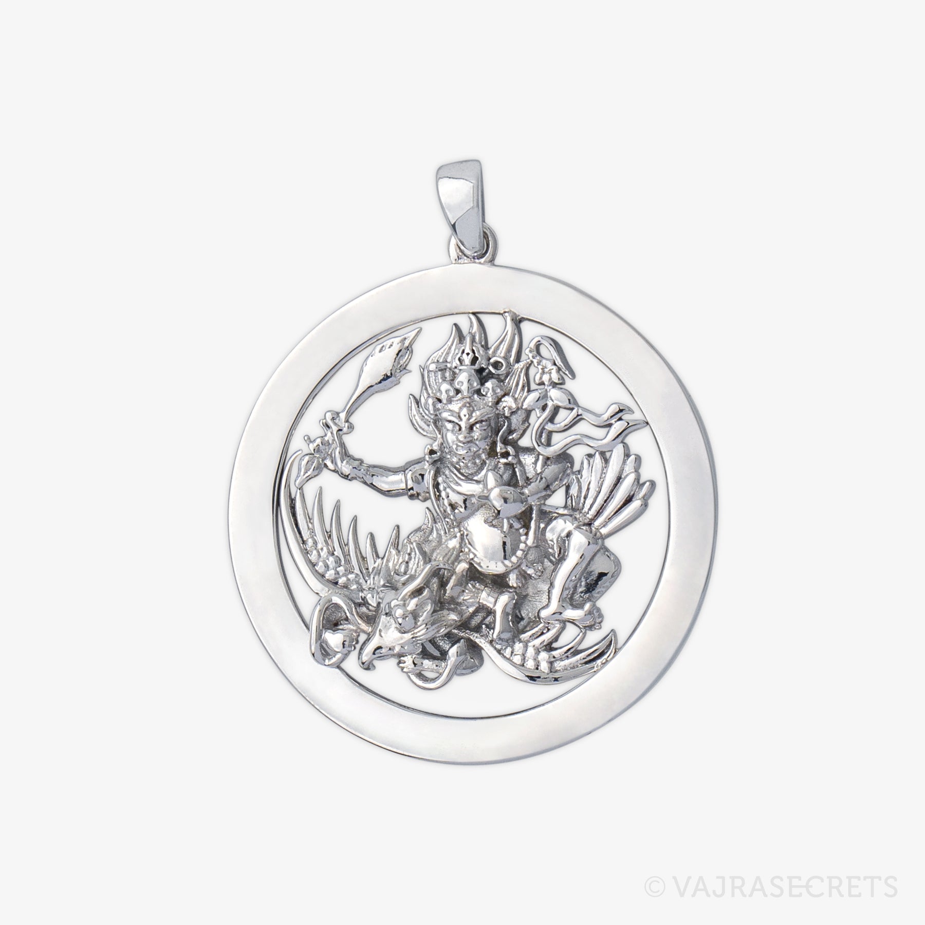 A delicate Trakze mounted on a hollow round frame. Made from sterling silver, this pendant combines understated elegance with everyday wearability. Wear him close to your heart and receive powerful protection against harm, spirits and black magic.