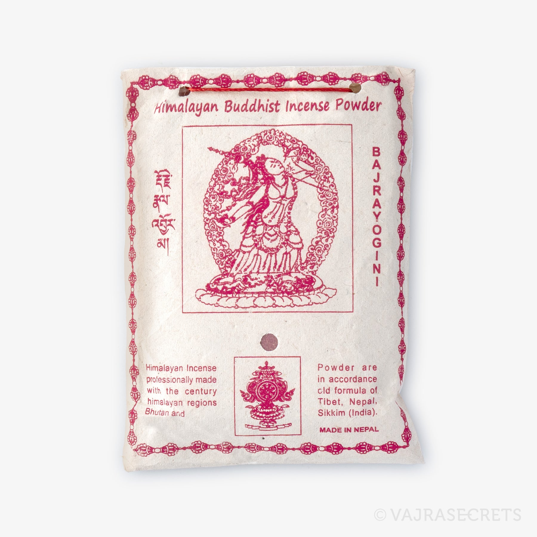 Vajrayogini Tibetan Incense Powder is handmade from medicinal herbs, oils, resins and spices from the Himalayan mountains, following a strict formula found in ancient scriptural texts. When burnt, it releases a rich and spicy aroma.