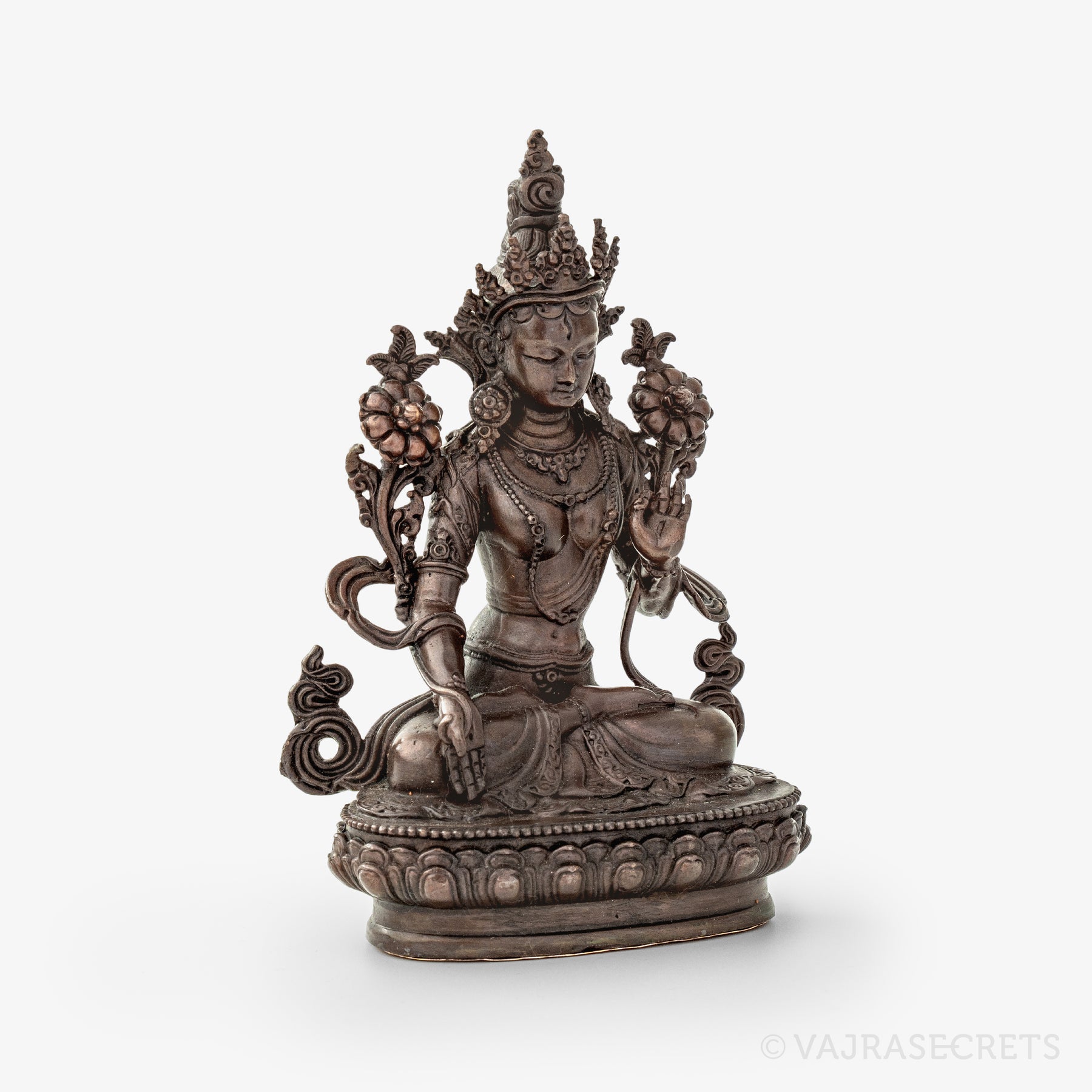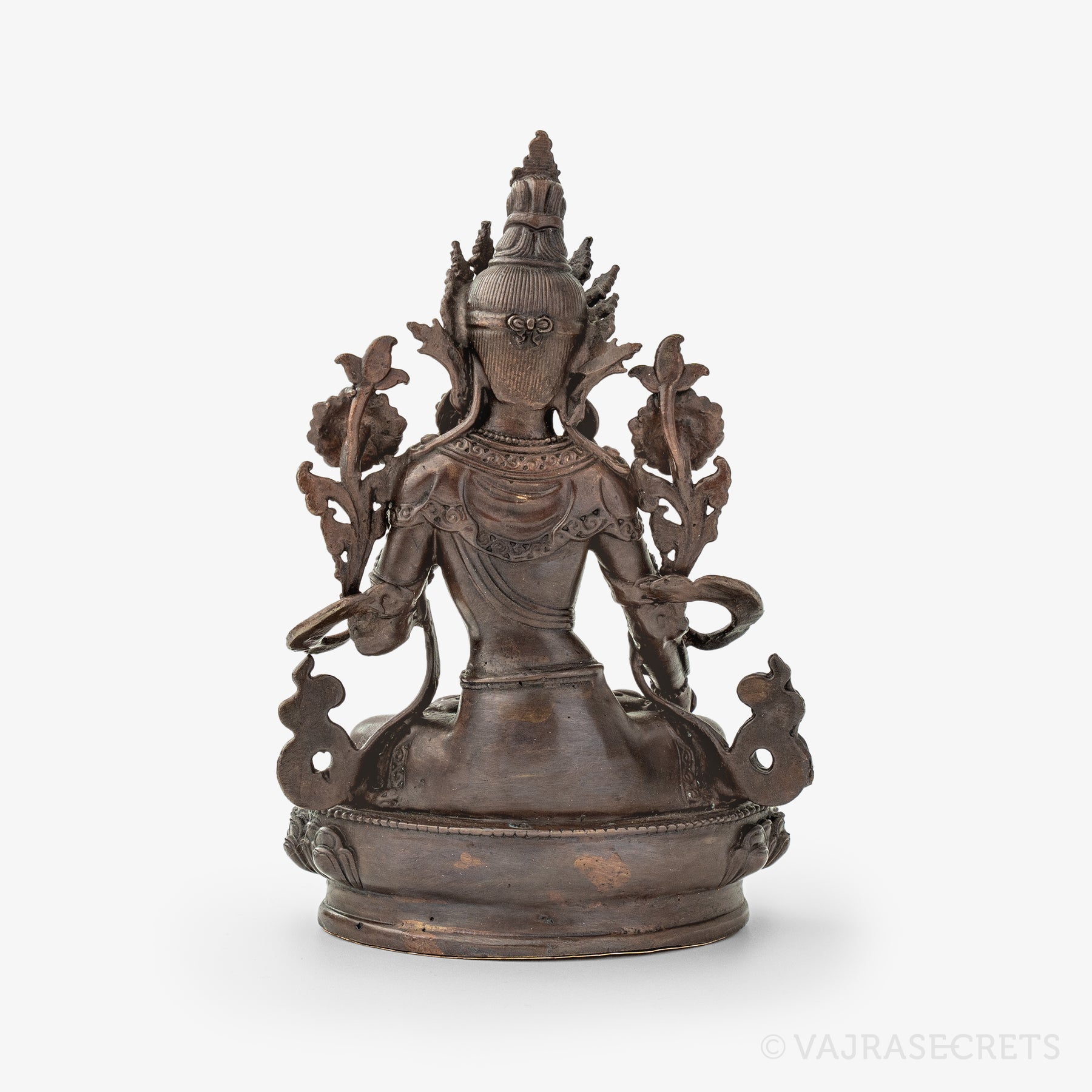 A handcrafted copper statue of the healing female Buddha White Tara, who grants long life and averts life-threatening situations. She is especially beneficial for those who are older or who need healing. Her practice also helps quell anger, hatred and jealousy, and reduces miserliness, desire and attachment. Suitable for a small shrine at home, in the workplace, and for anyone who would like to tap into White Tara's blessings of longevity.