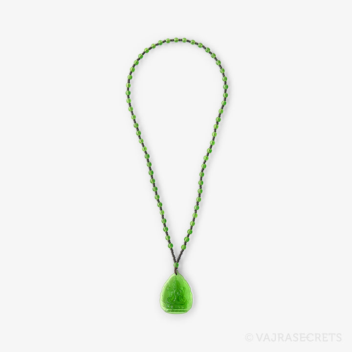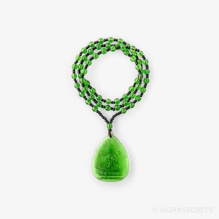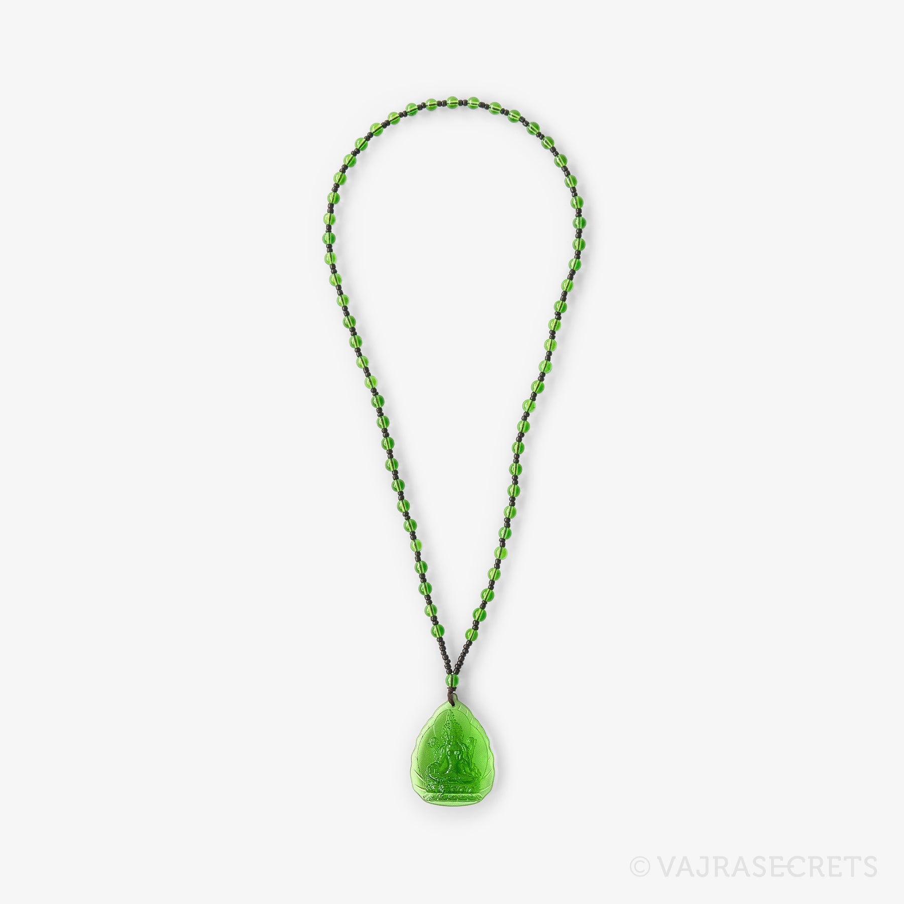 A Chinese crystal (liuli) pendant of the Compassionate Mother Green Tara, set against a bodhi leaf backing for safe journeys on the road. Hang it from your vehicle’s rear view mirror or keep in the glovebox to bring her blessings and protection everywhere you go.