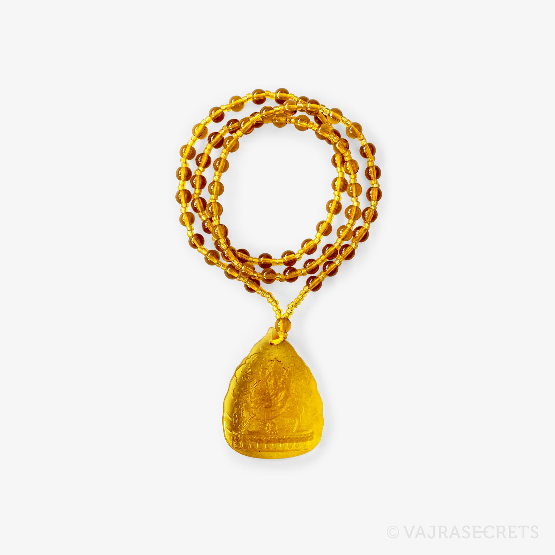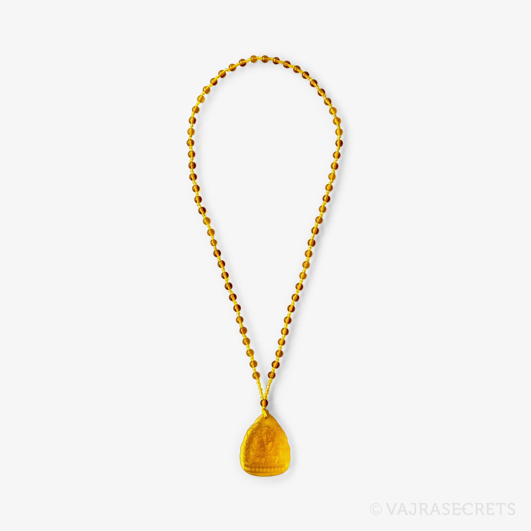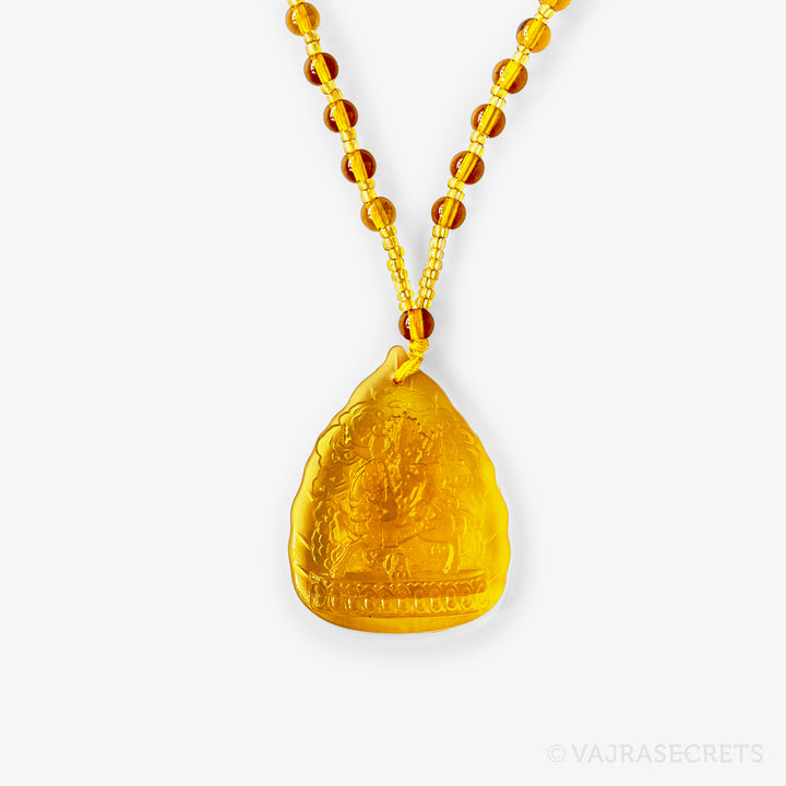 A Chinese crystal (liuli) pendant of Gyenze the Wishfulfiller, set against a bodhi leaf backing for safe journeys on the road. Hang it from your vehicle’s rear view mirror or keep in the glovebox to bring his blessings and protection everywhere you go.
