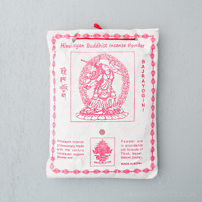 Vajrayogini Tibetan Incense Powder is handmade from medicinal herbs, oils, resins and spices from the Himalayan mountains, following a strict formula found in ancient scriptural texts. When burnt, it releases a rich and spicy aroma.