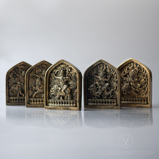 An exquisite collection of Dorje Shugden Five Families Tsa Tsa with antique bronze finish. Dharma Protector Dorje Shugden is the wrathful emanation of the Buddha of Wisdom, Manjushri. Fierce yet compassionate, he manifests in five different forms, each representing a different type of enlightened activity and bring the benefits of healing, abundance, control, protection and wisdom.