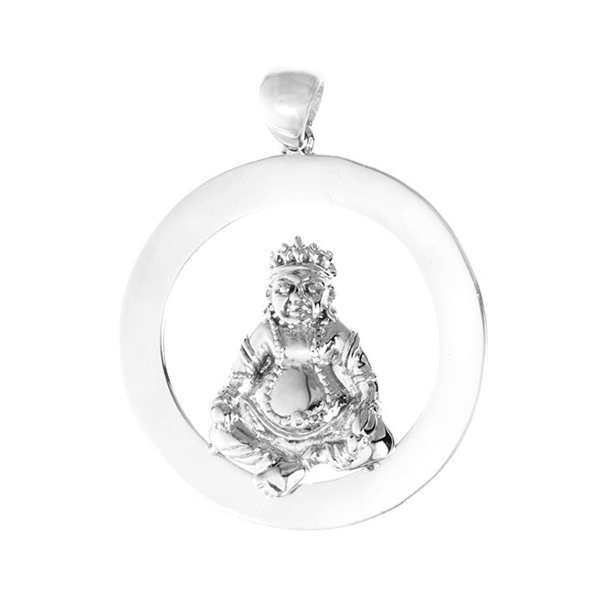 A delicate Buddha Dzambala mounted on a hollow round frame. From one of The Emptiness Collection, this pendant combines understated elegance with everyday wearability. Wear him close to your heart and be blessed with spiritual wealth and overcome emotional poverty: miserliness, greed and the inability to give or share.