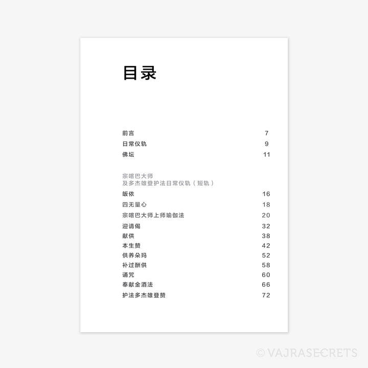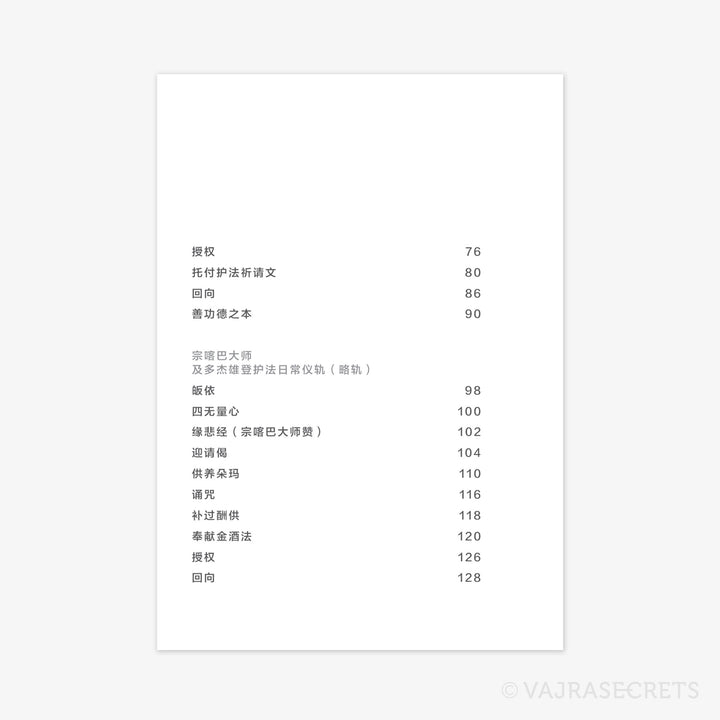 这本关于宗喀巴大师和多杰雄登护法的完整日常仪轨,由尊贵的第廿五世詹杜固仁波切根据传统经文编撰而成。此仪轨分为短轨和略轨,并附上藏文与中文两个版本。无论对曾经接受灌顶与否的人都有极大助益。