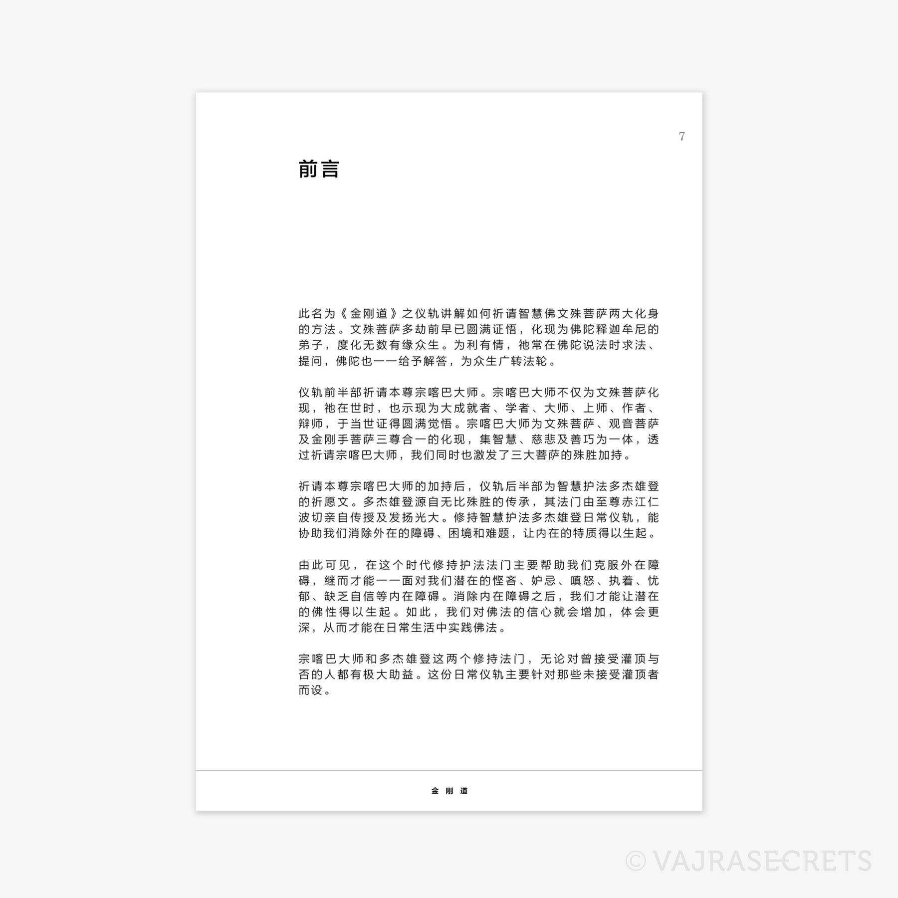 《金刚道》一书讲解如何祈请智慧佛文殊菩萨两大化身的方法。文殊菩萨多劫前早已圆满证悟,化现为佛陀释迦牟尼的弟子,度化无数有缘众生。