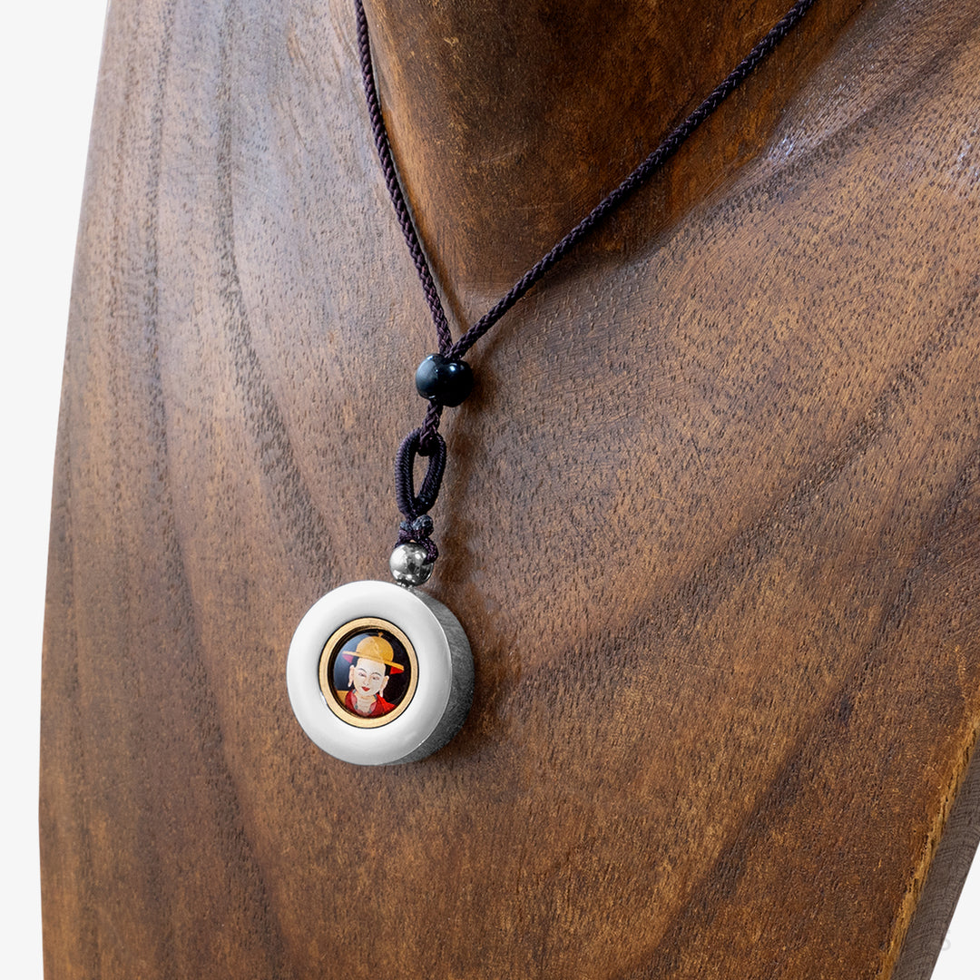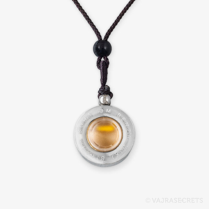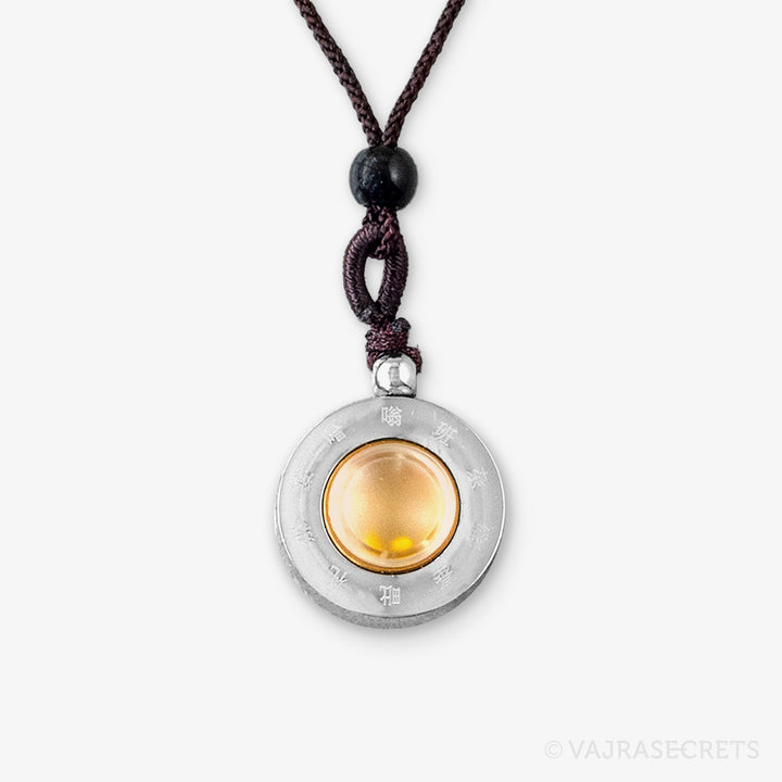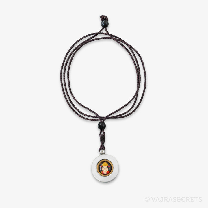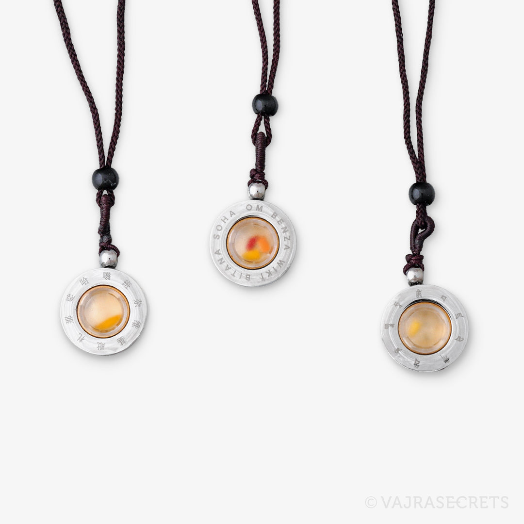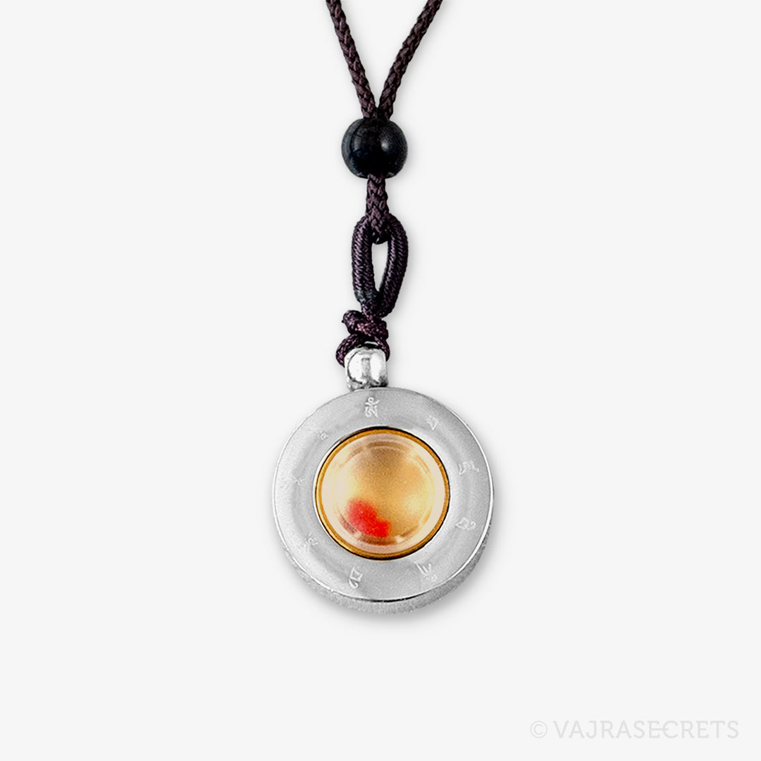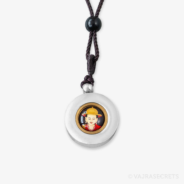 A stainless steel pendant containing Protector Rice blessed by Dorje Shugden in full trance. The front features an image of Dorje Shugden in peaceful form, and the back is carved with his sacred mantra. The protector rice is visible through a frosted window. Wear him close to your heart and be blessed with protection, healing, positive situations and fulfilled wishes.