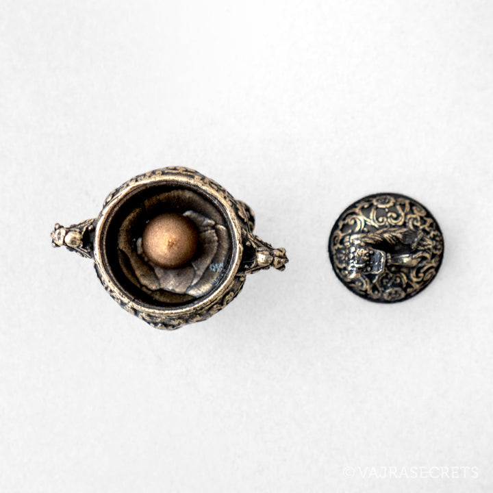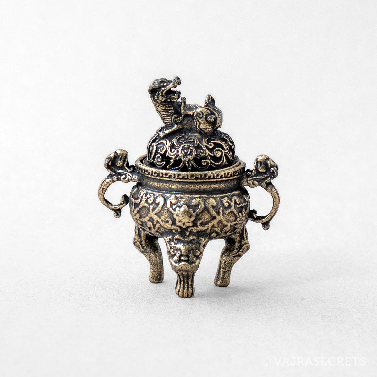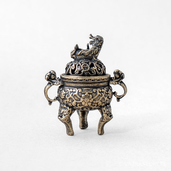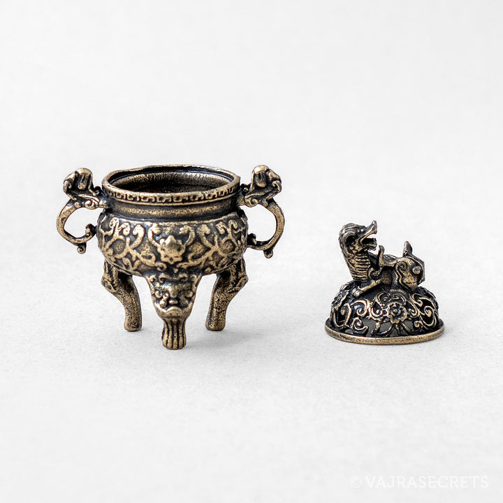 A miniature metal incense burner with a pixiu figurine on the lid. Representing wealth, prosperity and protection, the pixiu is a mythical Chinese creature with the head of a dragon, the body of a lion, and the legs of a qilin.