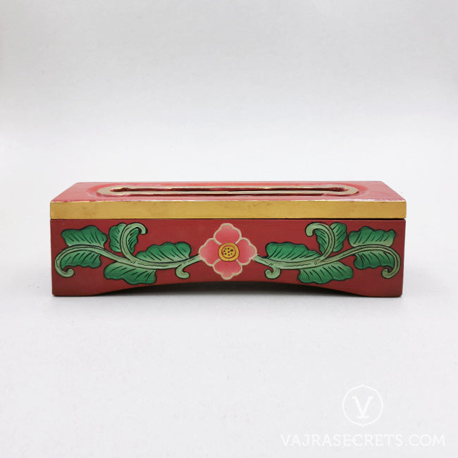 A handcrafted Tibetan-style wooden incense burner carved from Himalayan hardwood. Painted in traditional colours with a delicate floral motif.
