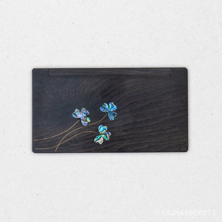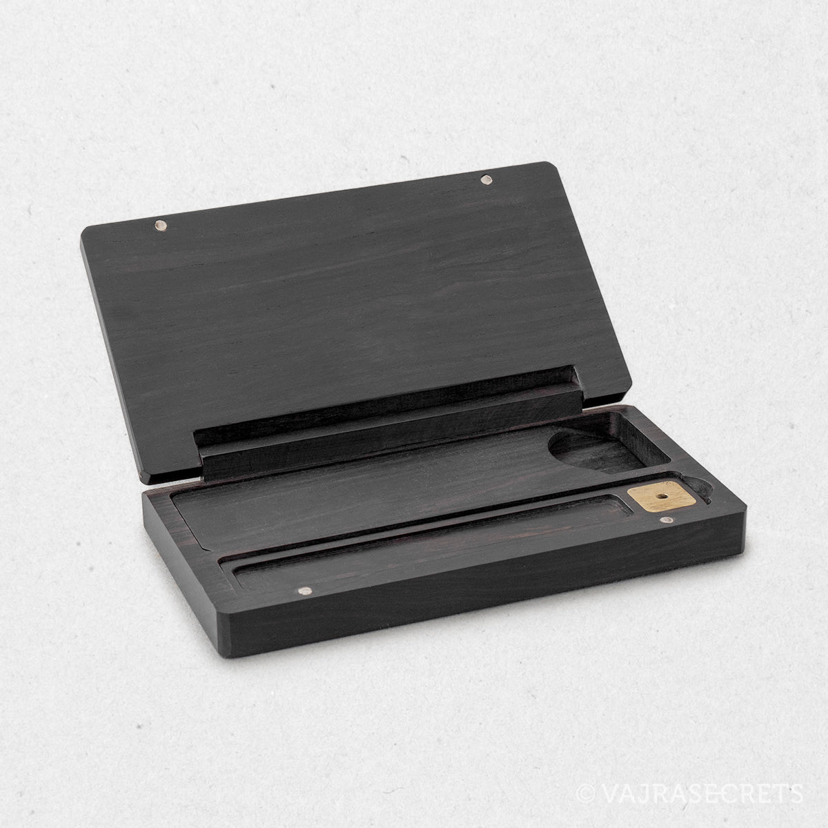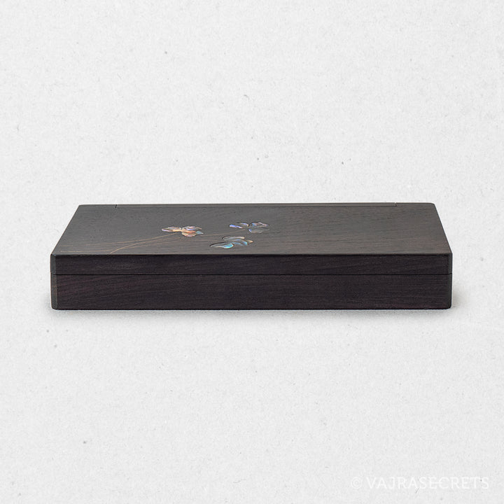 A lightweight and compact travel incense box set comprising of a miniature incense burner and storage holder. Made from dark wood, it features a delicate floral motif with mother of pearl inlay.