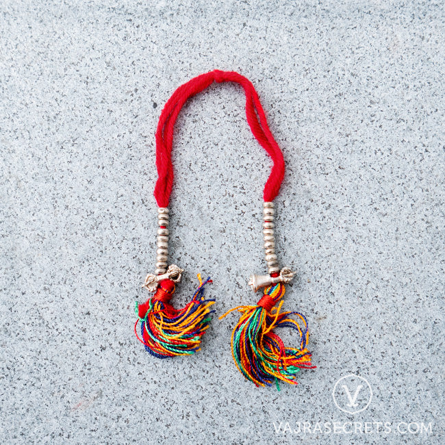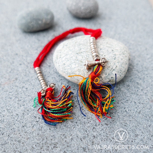 This set of two metal mala counters, each with ten small rings or beads, are a convenient way to keep track of mantra recitations and counts. Featuring traditional bell and vajra charms (symbolising the divine energies of wisdom and compassion) on sturdy cotton cord with traditional five-colour tassels on the ends, these mala counters can be placed anywhere on your mala or even used separately.