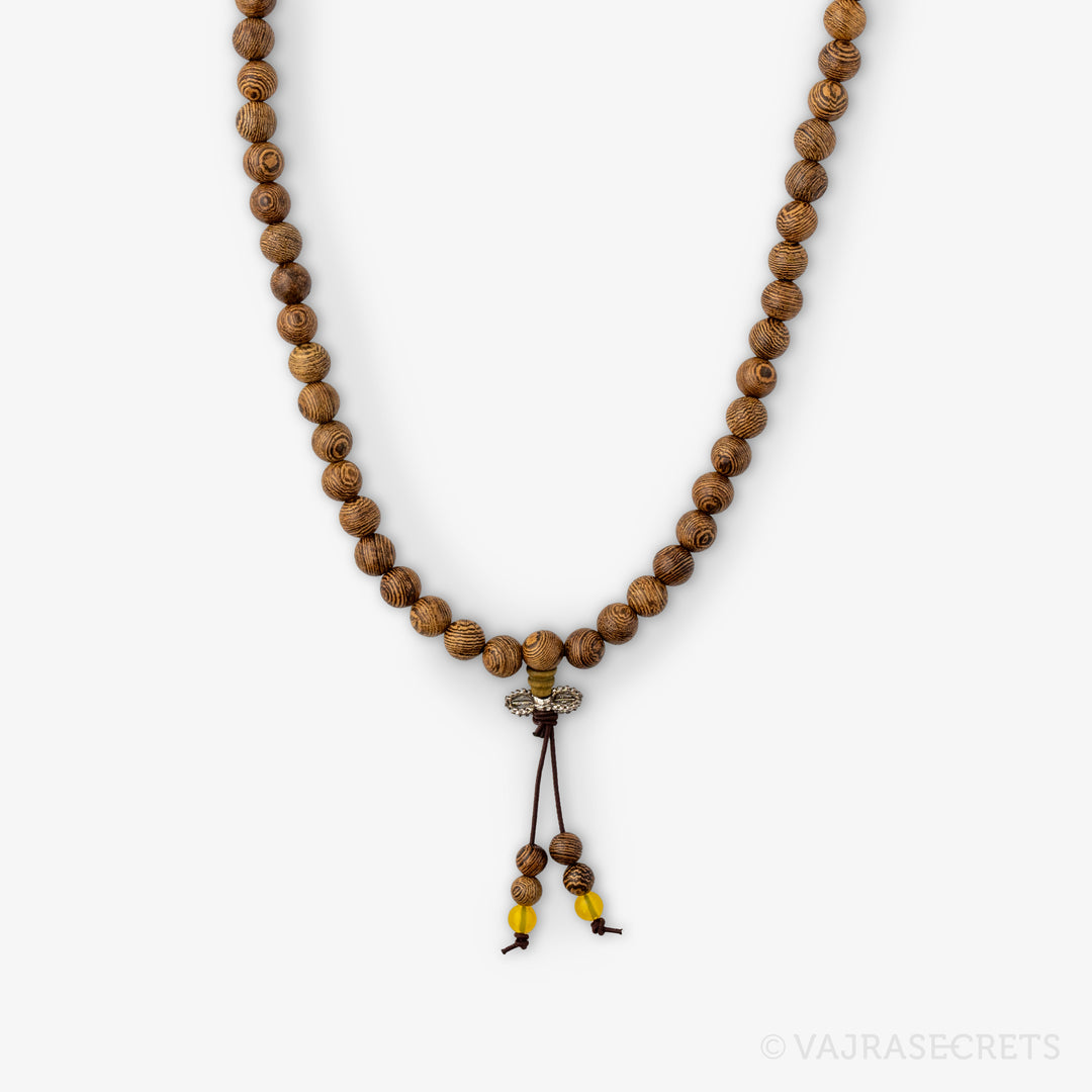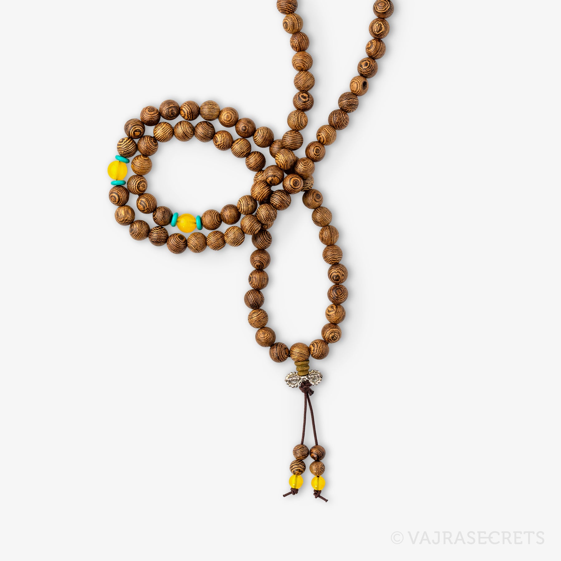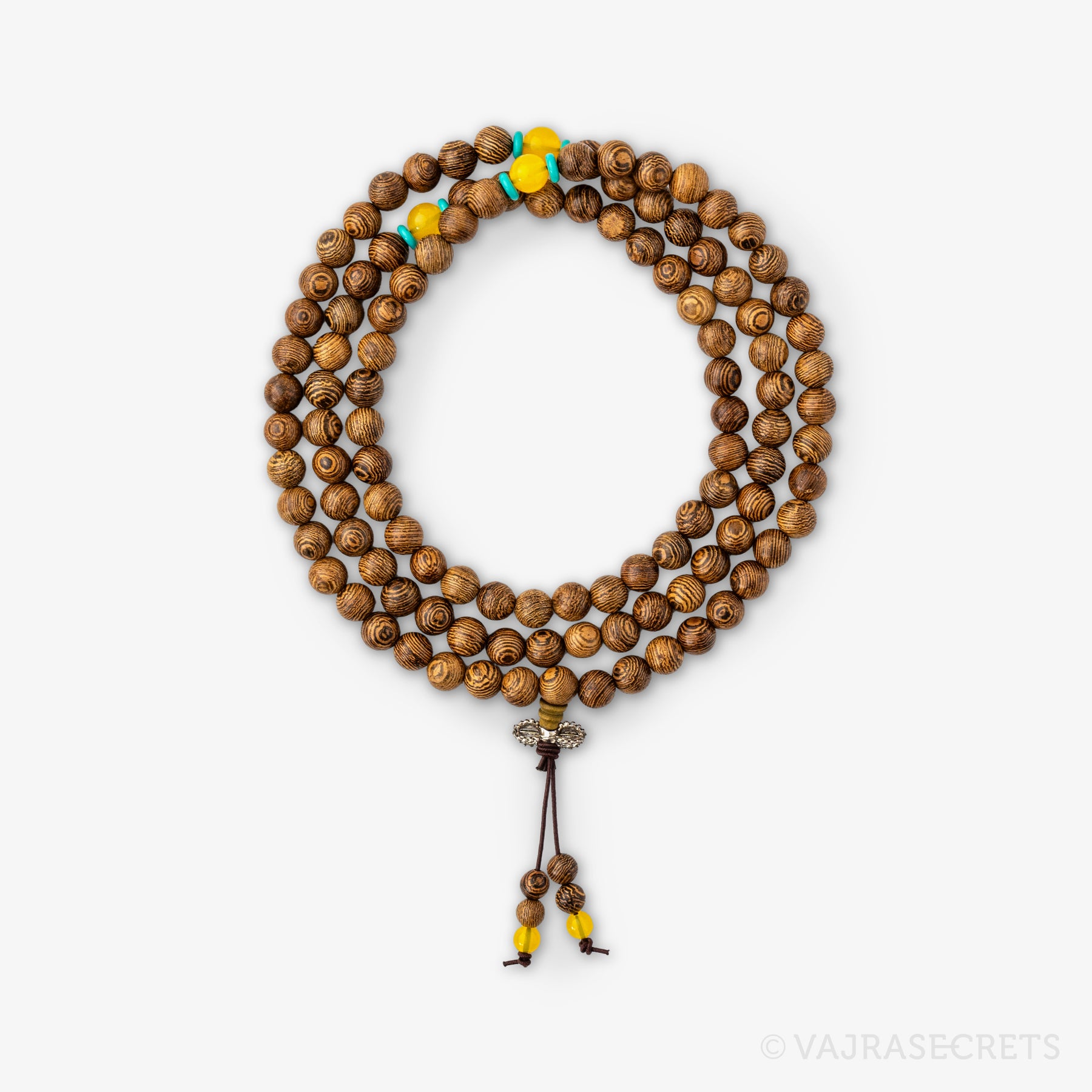 A Tibetan-style mala (prayer beads or Buddhist rosary) made from 108 wenge wood beads, yellow crystal dividers and faux turquoise spacers.