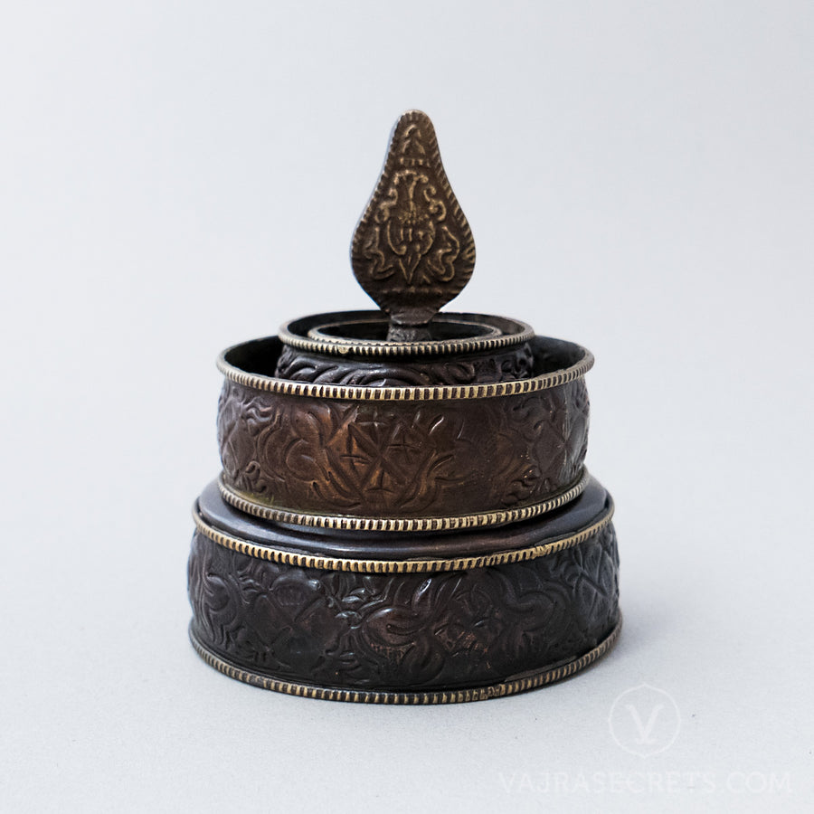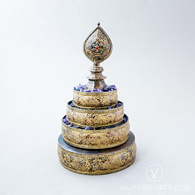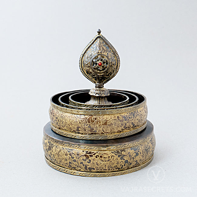 A traditional multi-tiered mandala offering set, handcrafted from copper and featuring delicate carvings of Tibetan motifs. Representing all that is beautiful and precious in the universe being offered up to the Buddhas, mandala offerings generate immense merits that will help propel you towards Enlightenment.