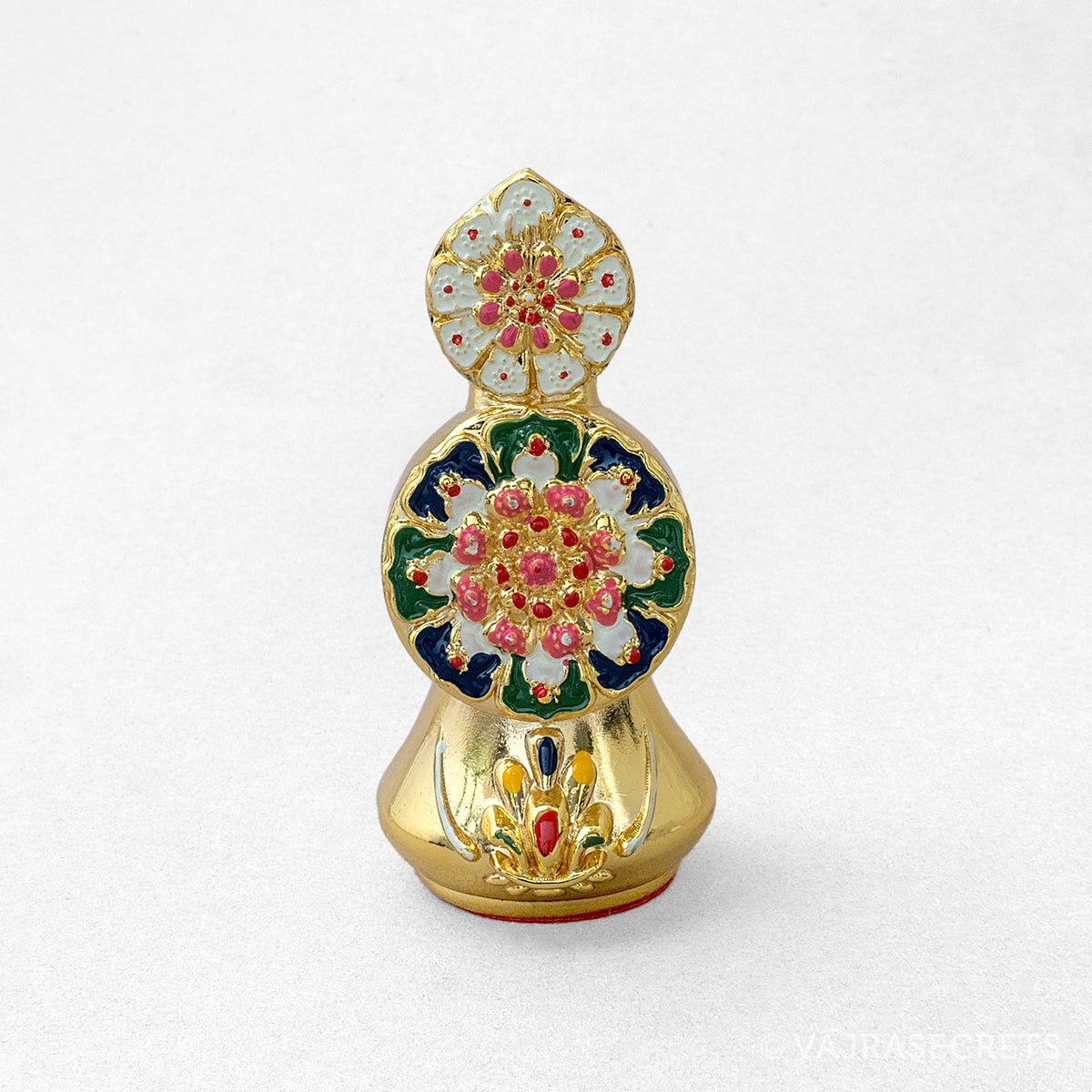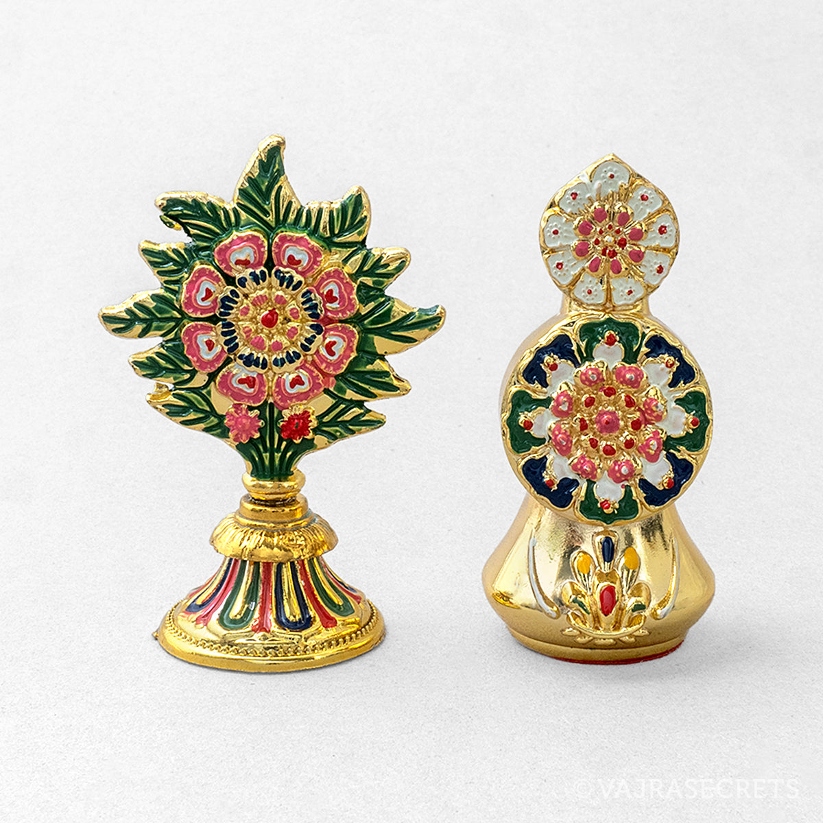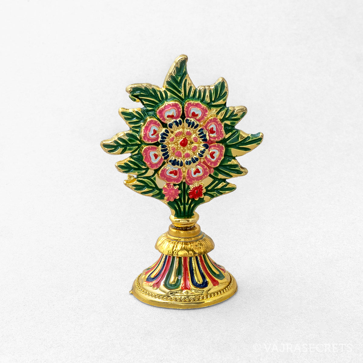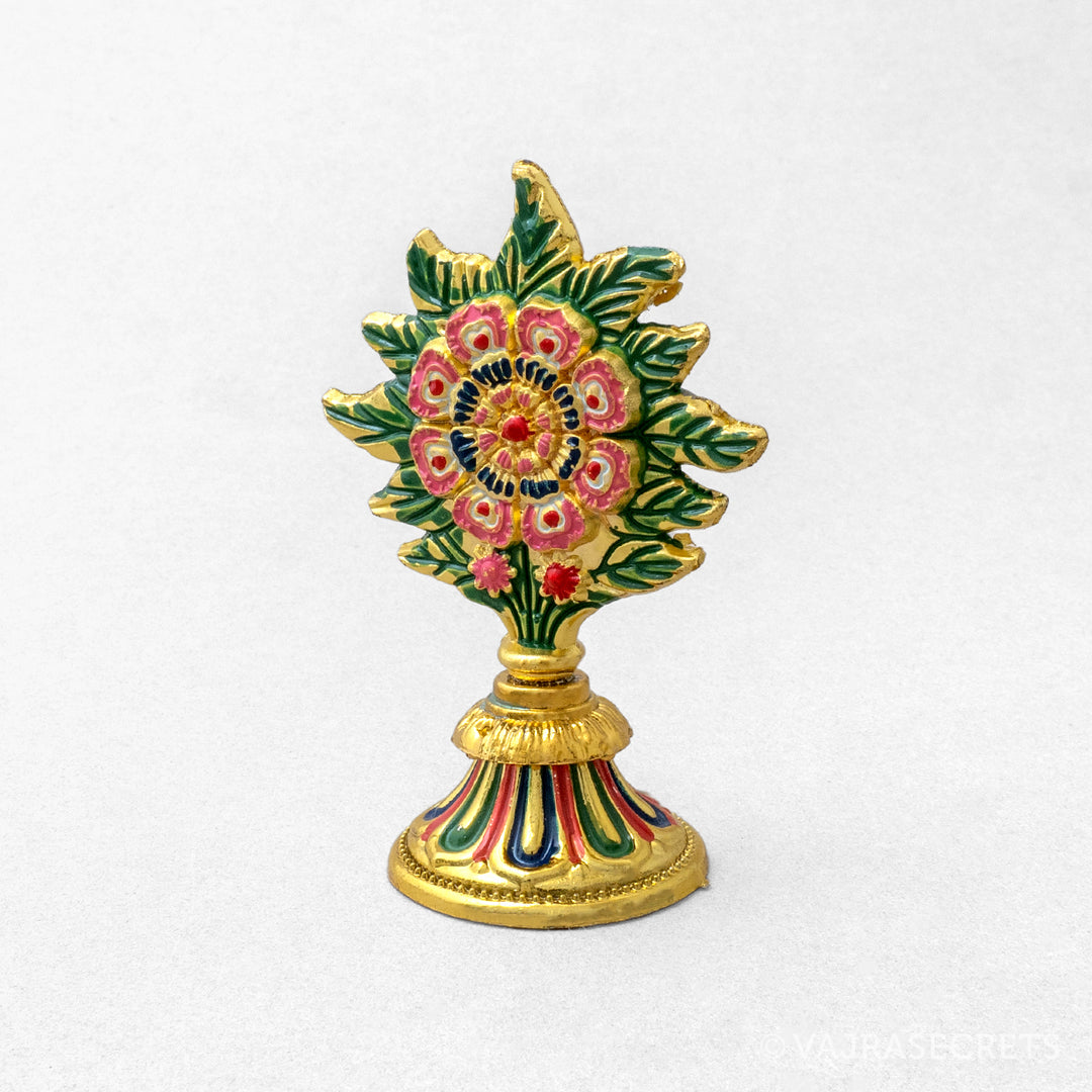 A set of traditional flower and food (torma) offerings made from alloy and painted in bright colours. Add them to the peaceful sensory offerings on your altar or shrine to support your prayers and enhance your accumulation of merit.