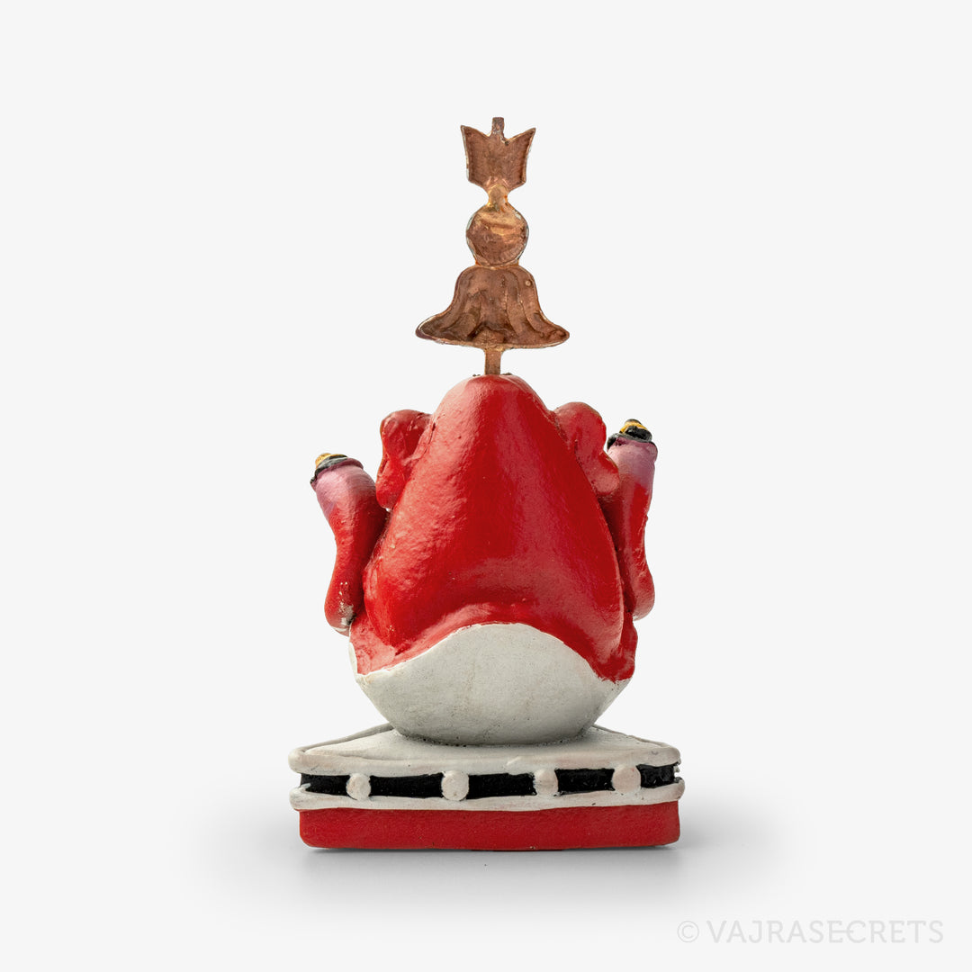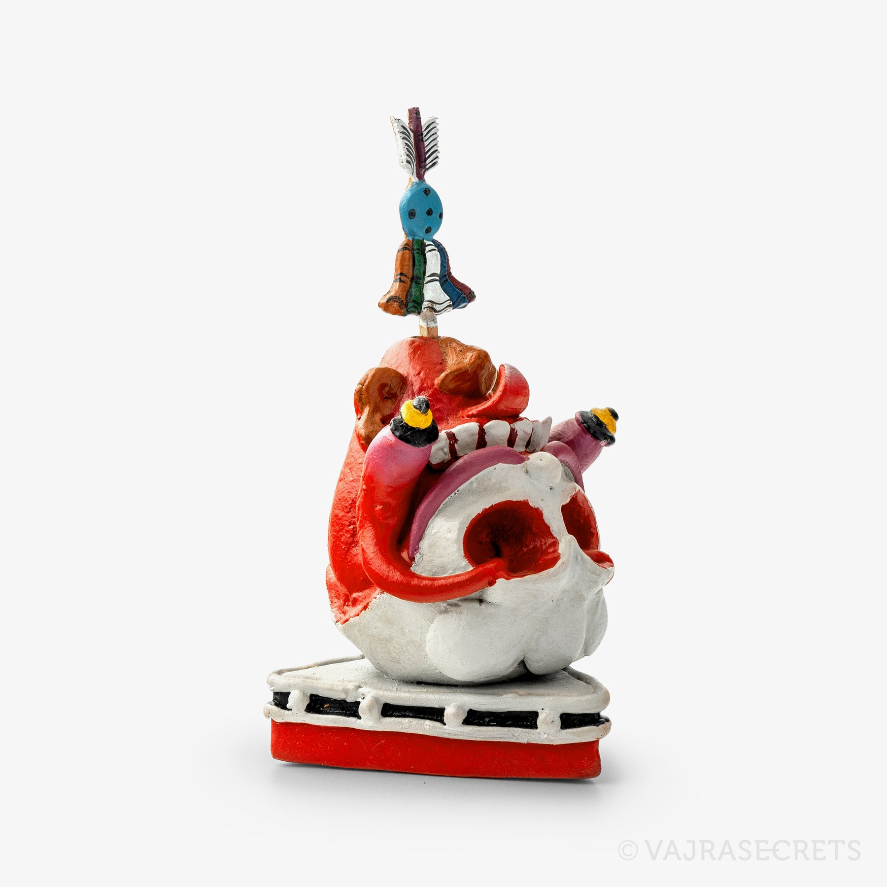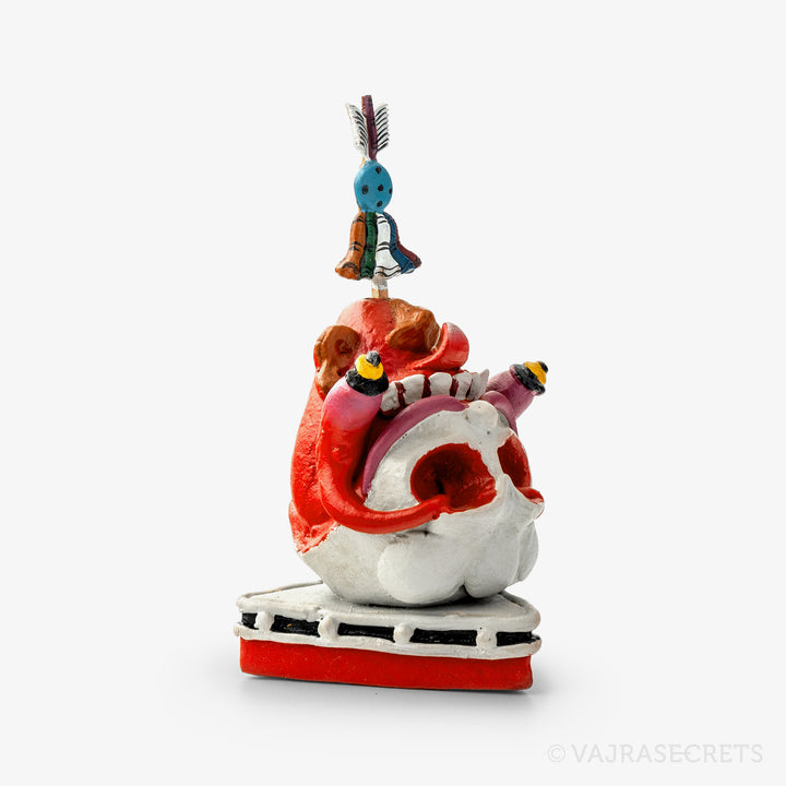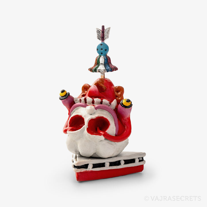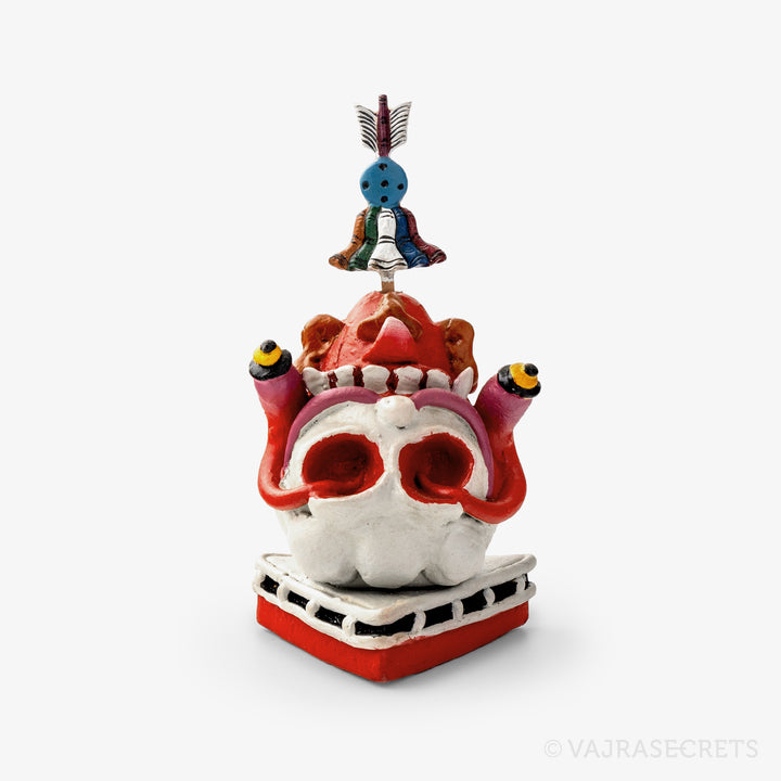 A permanent representation of the traditional Gelugpa wrathful flower which is part of the wrathful sensory offerings. Known as wangpo metok in Tibetan, the body of each flower is handmade by monks from a blend of medicinal herbs. The top ornament is made from copper and hand-painted with traditional designs.