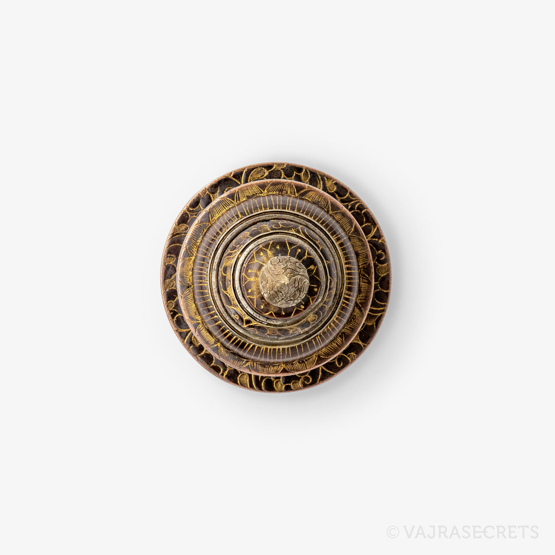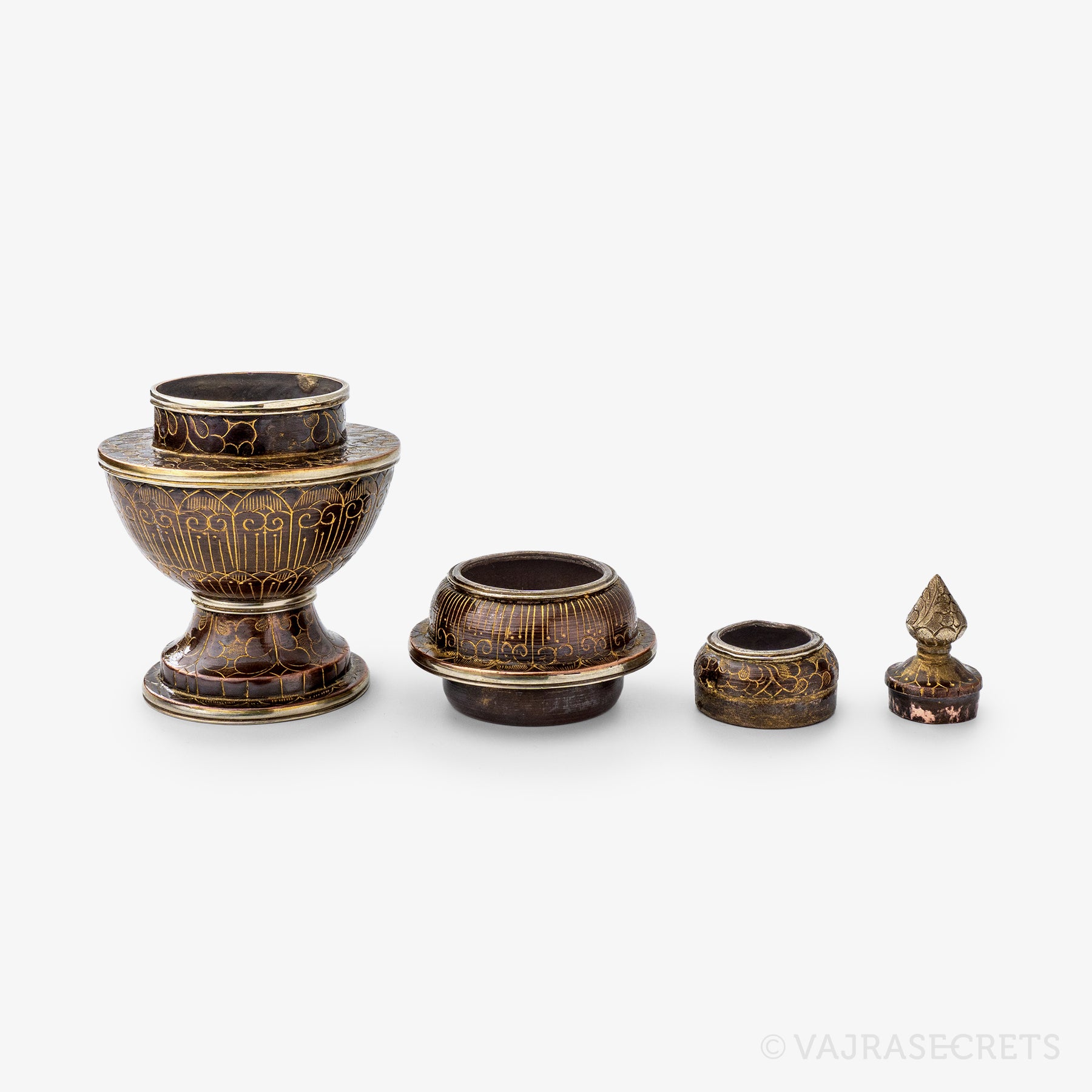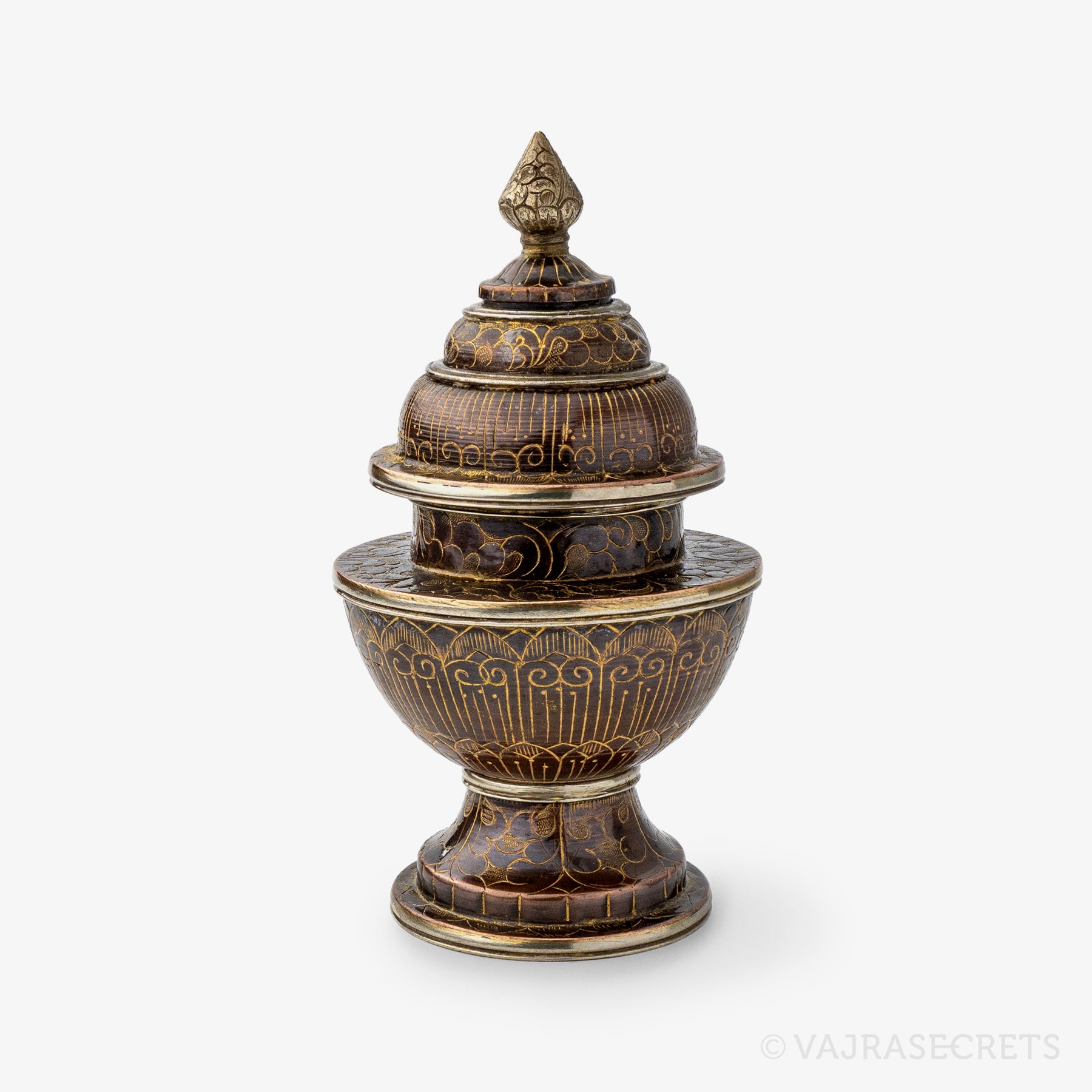 A traditional three-tiered Tibetan Ritual Rice Pot with an antique finish and delicate carvings of Tibetan motifs. It is used as a vessel for raw rice, barley and other ritual substances required during pujas and ceremonies. Suitable for practitioners of all levels.