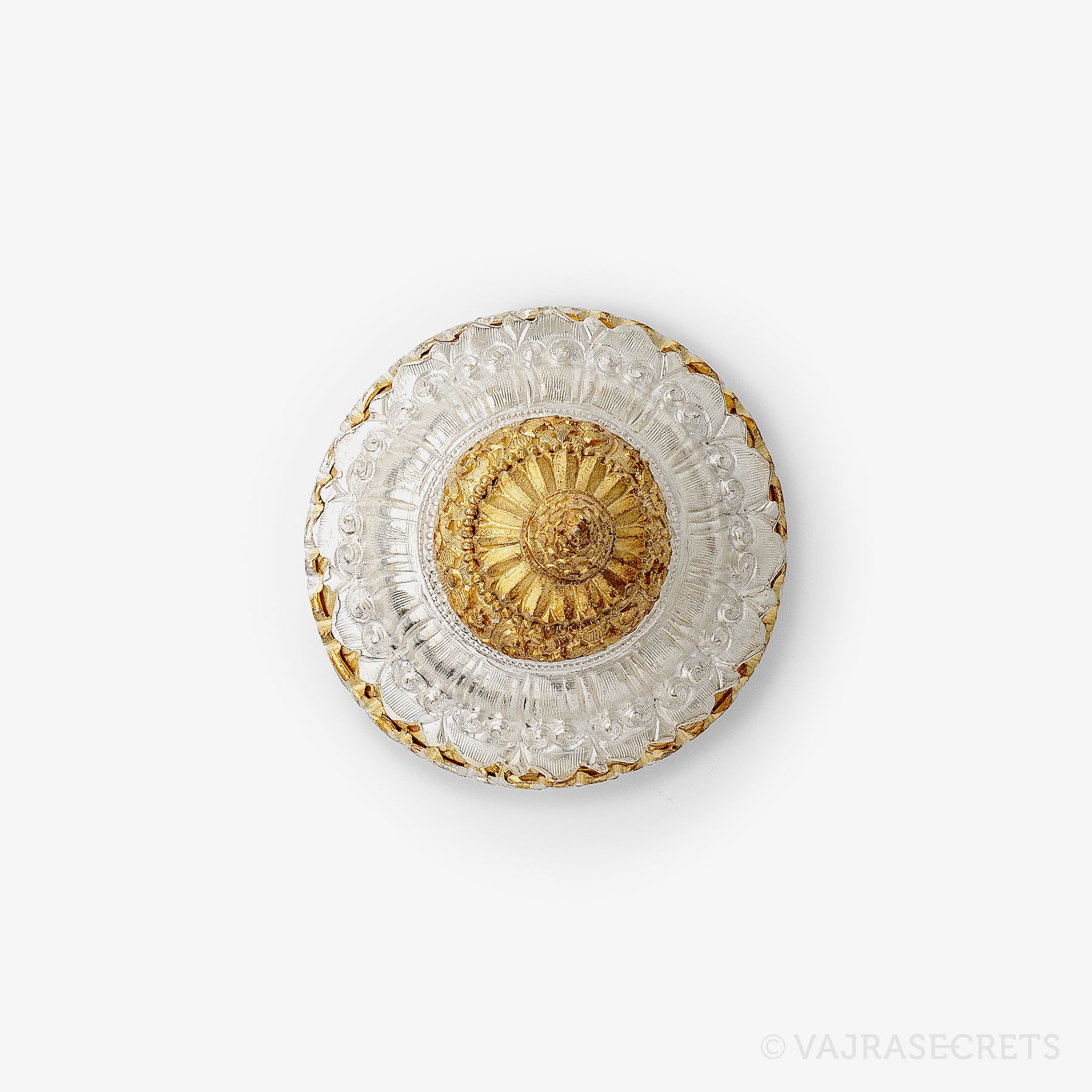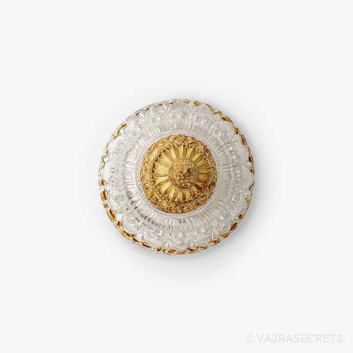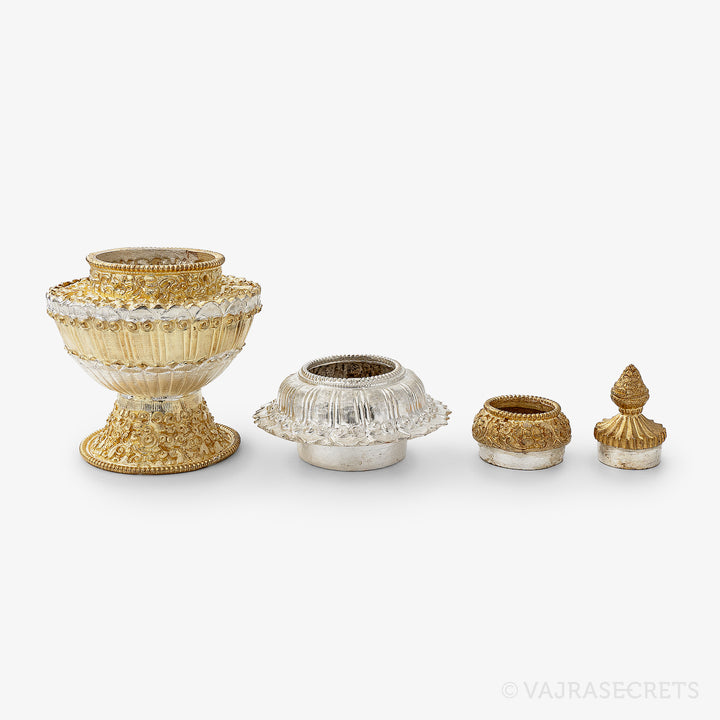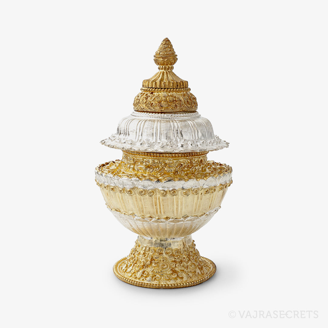A traditional three-tiered Tibetan Ritual Rice Pot with a gold and silver-plated finish and rich carvings of Tibetan motifs. It is used as a vessel for raw rice, barley and other ritual substances required during pujas and ceremonies. Suitable for practitioners of all levels.