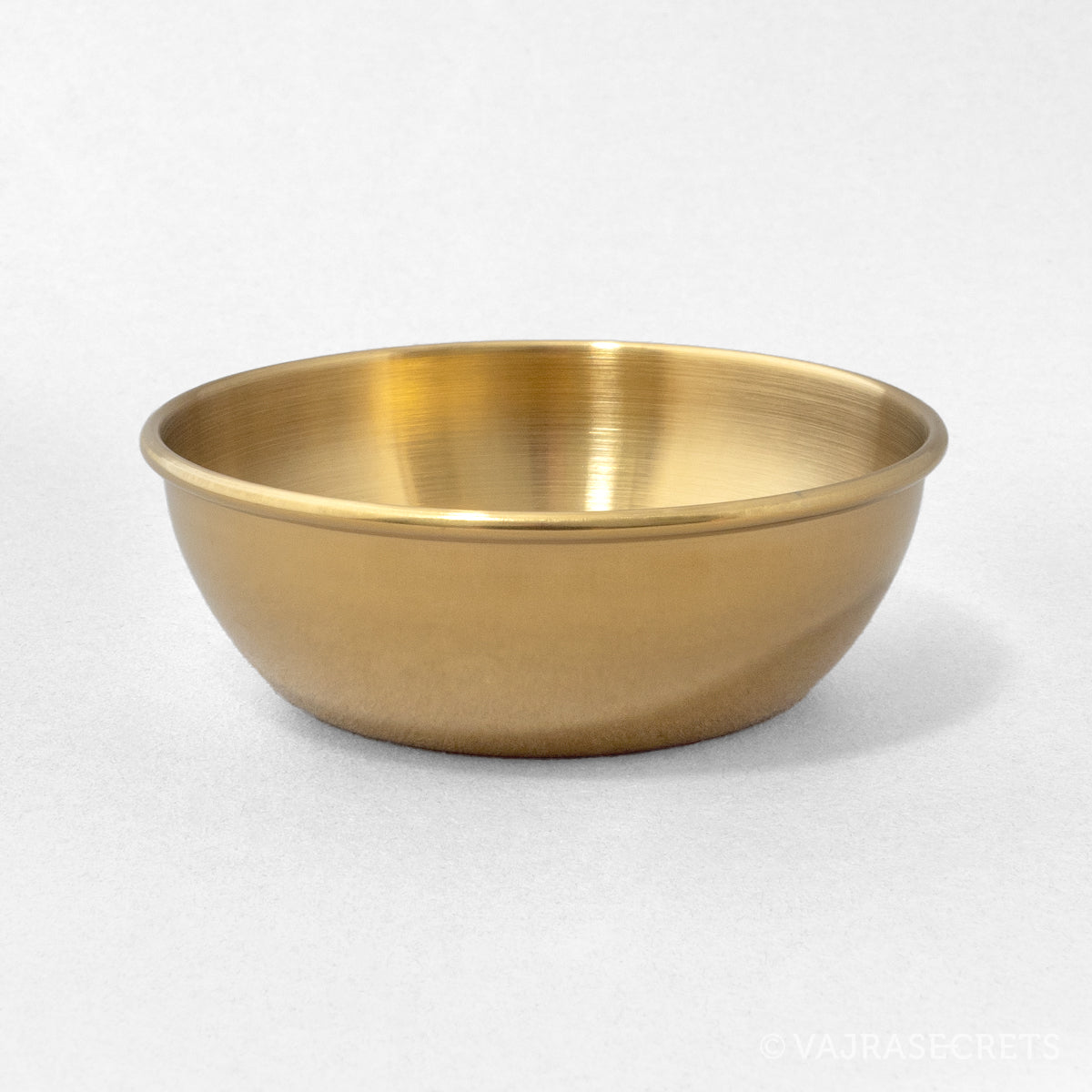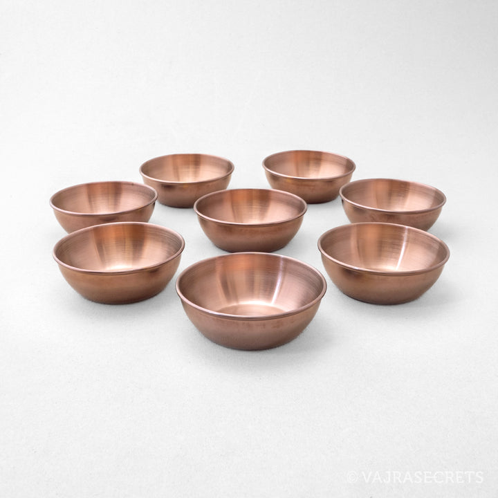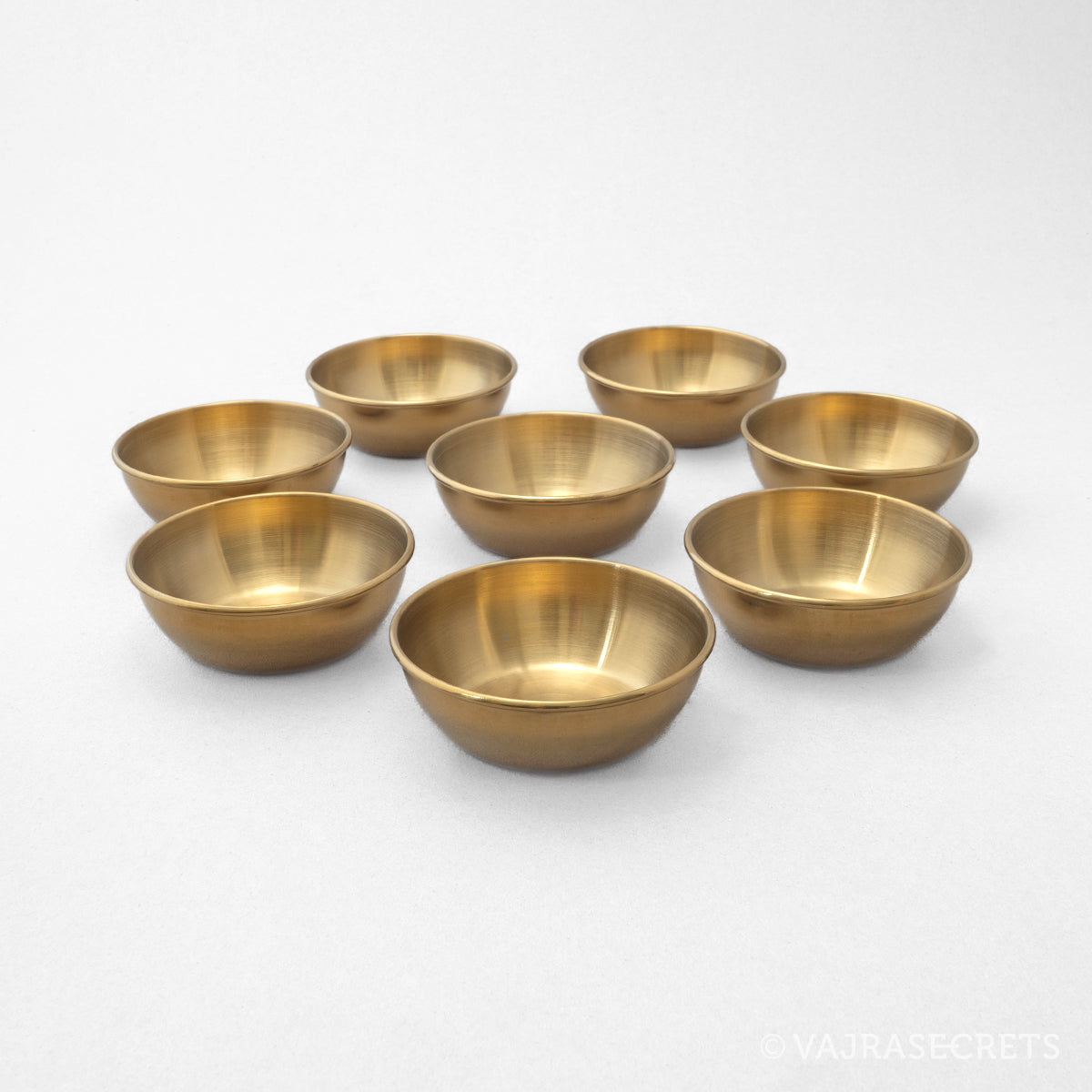 A set of eight stainless steel bowls in a sleek minimalist design. Use for offering pure water, the eight sensory objects, the five commitment substances, and so forth.