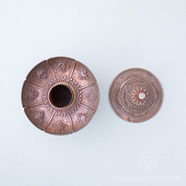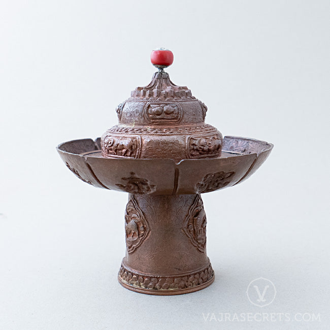This handcrafted ceremonial lama cup stand consists of an eight-petaled lotus stand and matching cover, featuring carvings of the eight auspicious signs and other traditional Tibetan motifs. Also known as a dhakya set, it is suitable for making offerings to lamas during Buddhist ceremonies and rituals, or to your guru's image on your personal shrine.