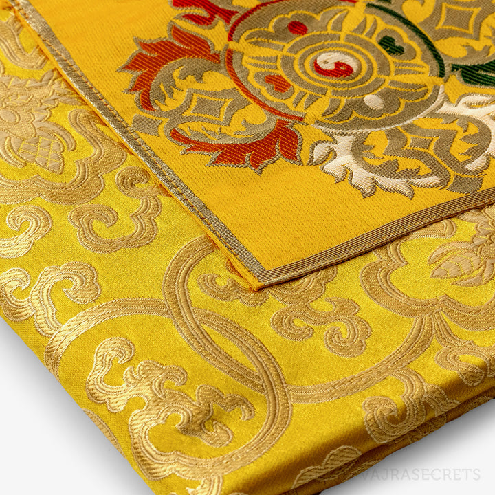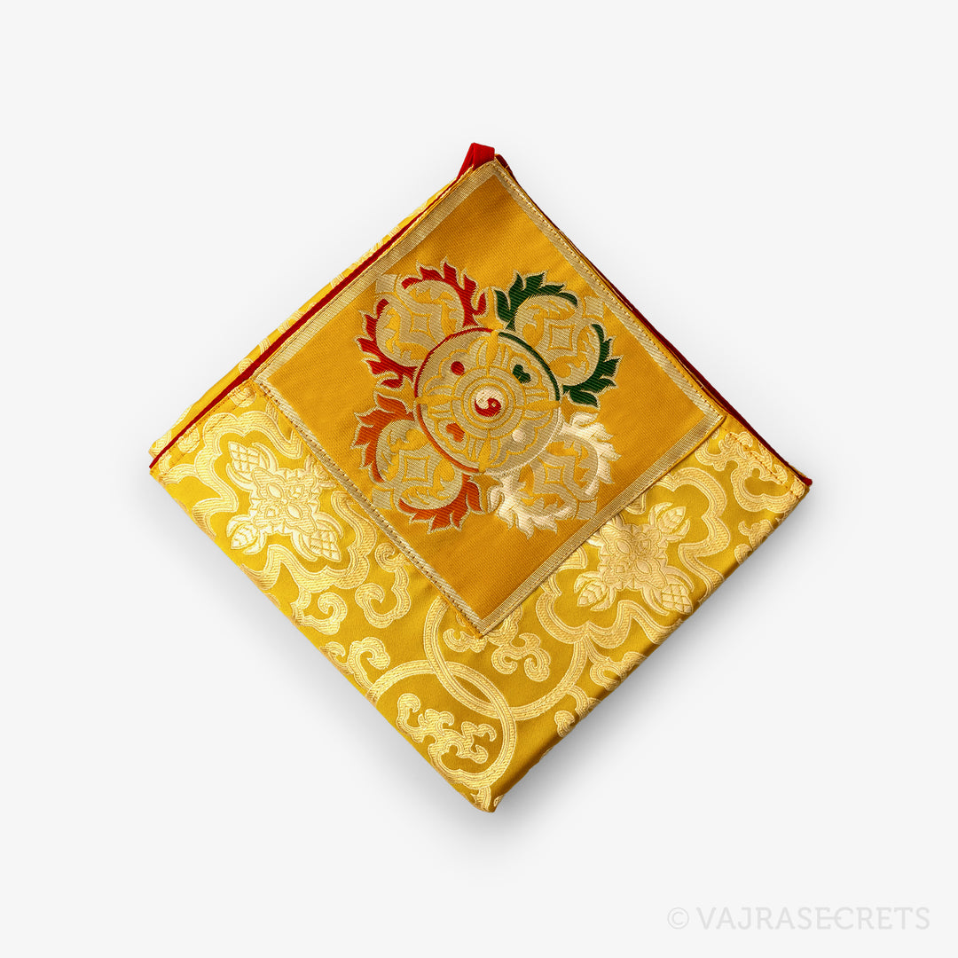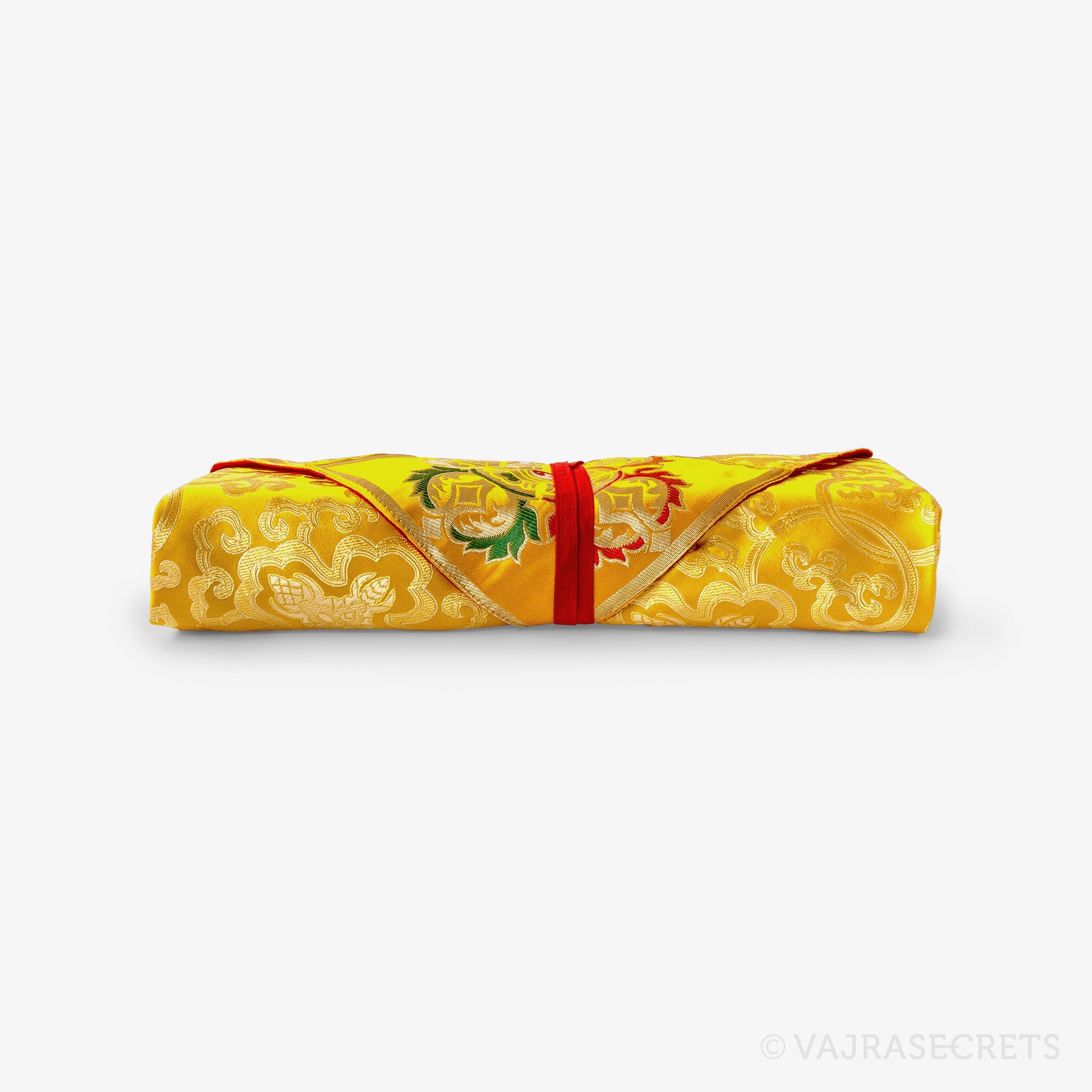 A traditional cloth wrap (peri) handmade from synthetic silk brocade with a decorative panel at one corner and a long fastening tie. It can be used for wrapping and storing Buddhist scriptures, Dharma books, prayer texts, mandala offering sets, ritual items and other blessed objects.