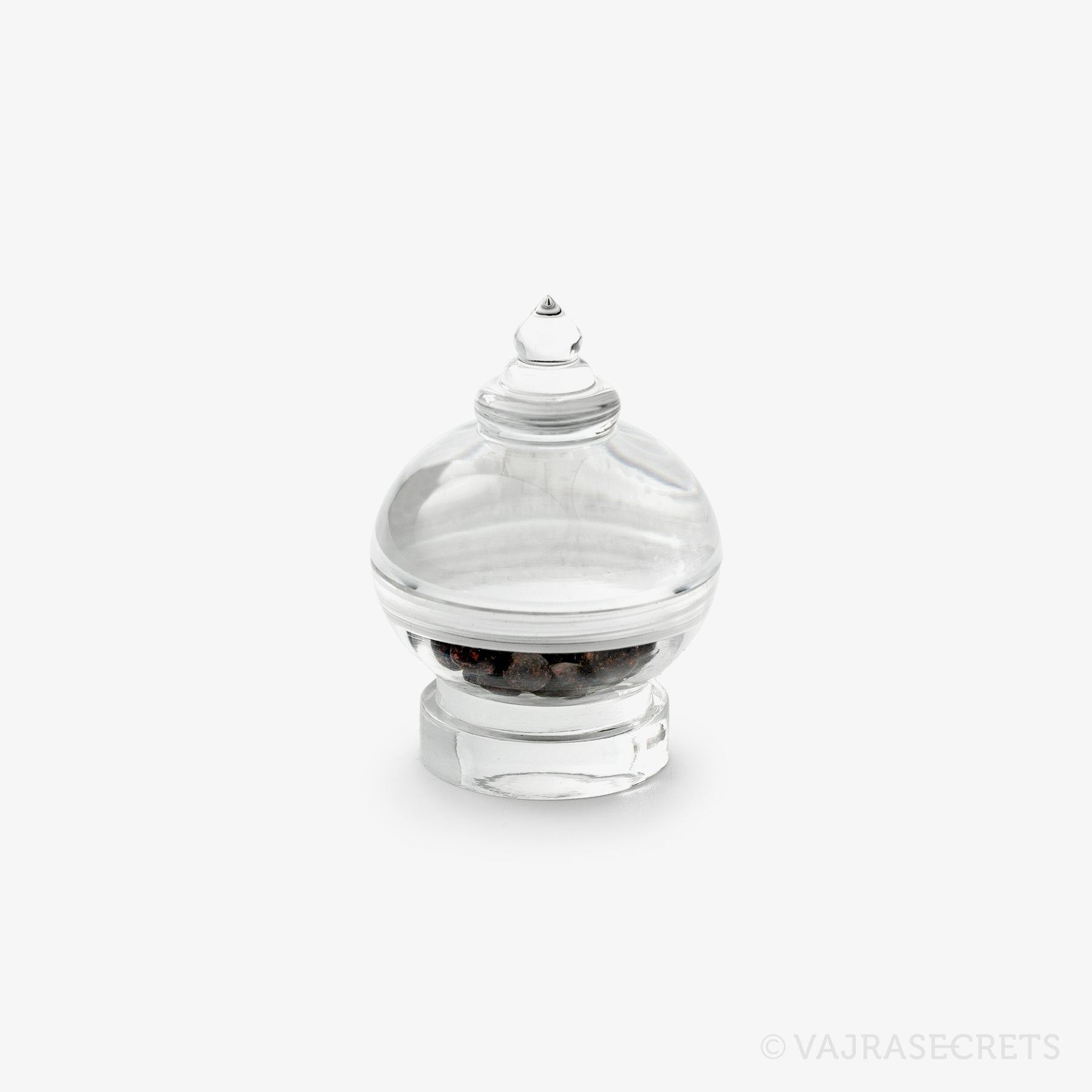 A miniature acrylic stupa featuring a screw-on hollow base to allow for the insertion of sacred items such as holy pills, precious relics, mantras and other blessed objects. Representing the Buddha’s limitless holy mind, place this stupa on the altar, in the shrine room or meditation area for daily veneration.