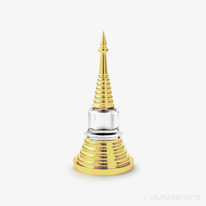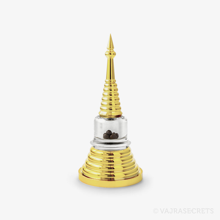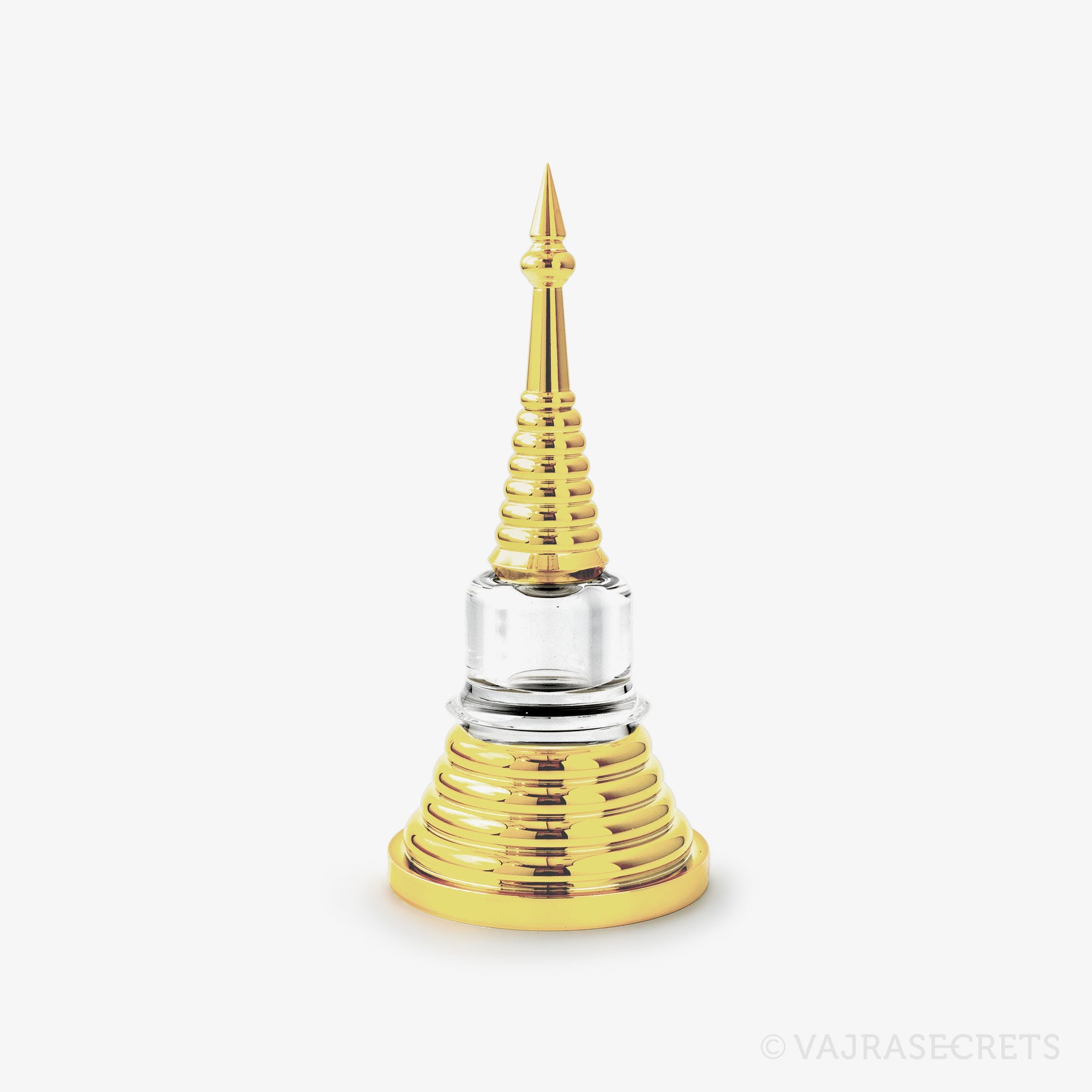 An acrylic stupa with gold finish featuring a screw-on hollow base for insertion of sacred items such as holy pills, precious relics, mantras and other blessed objects. Representing the Buddha’s limitless holy mind, place this stupa on the altar, in the shrine room or meditation area for daily veneration.