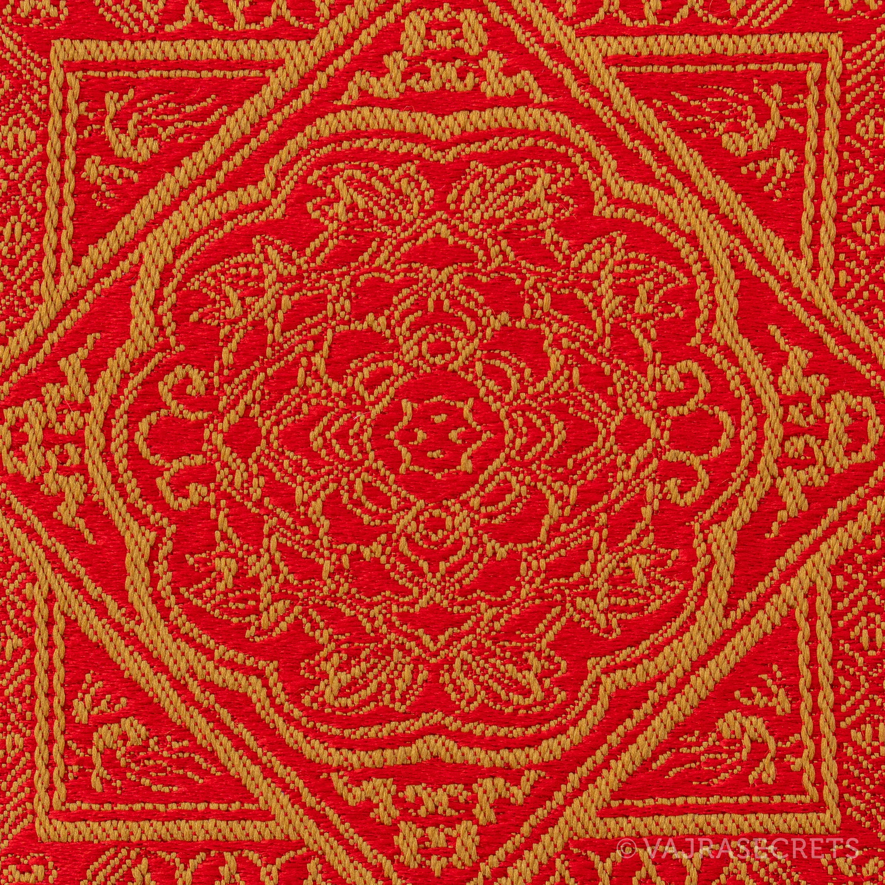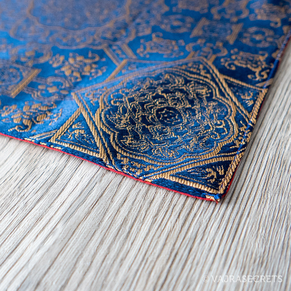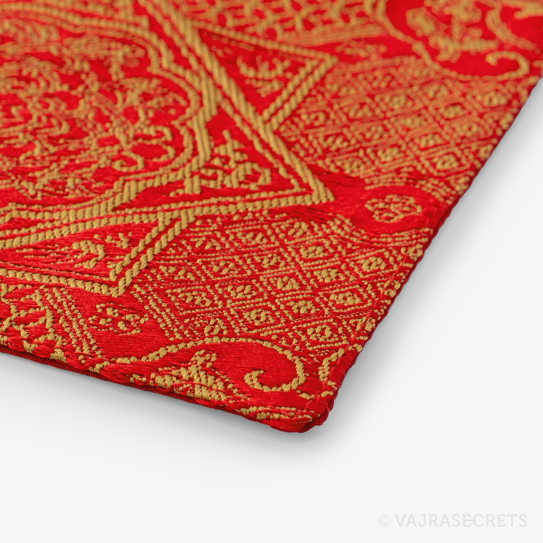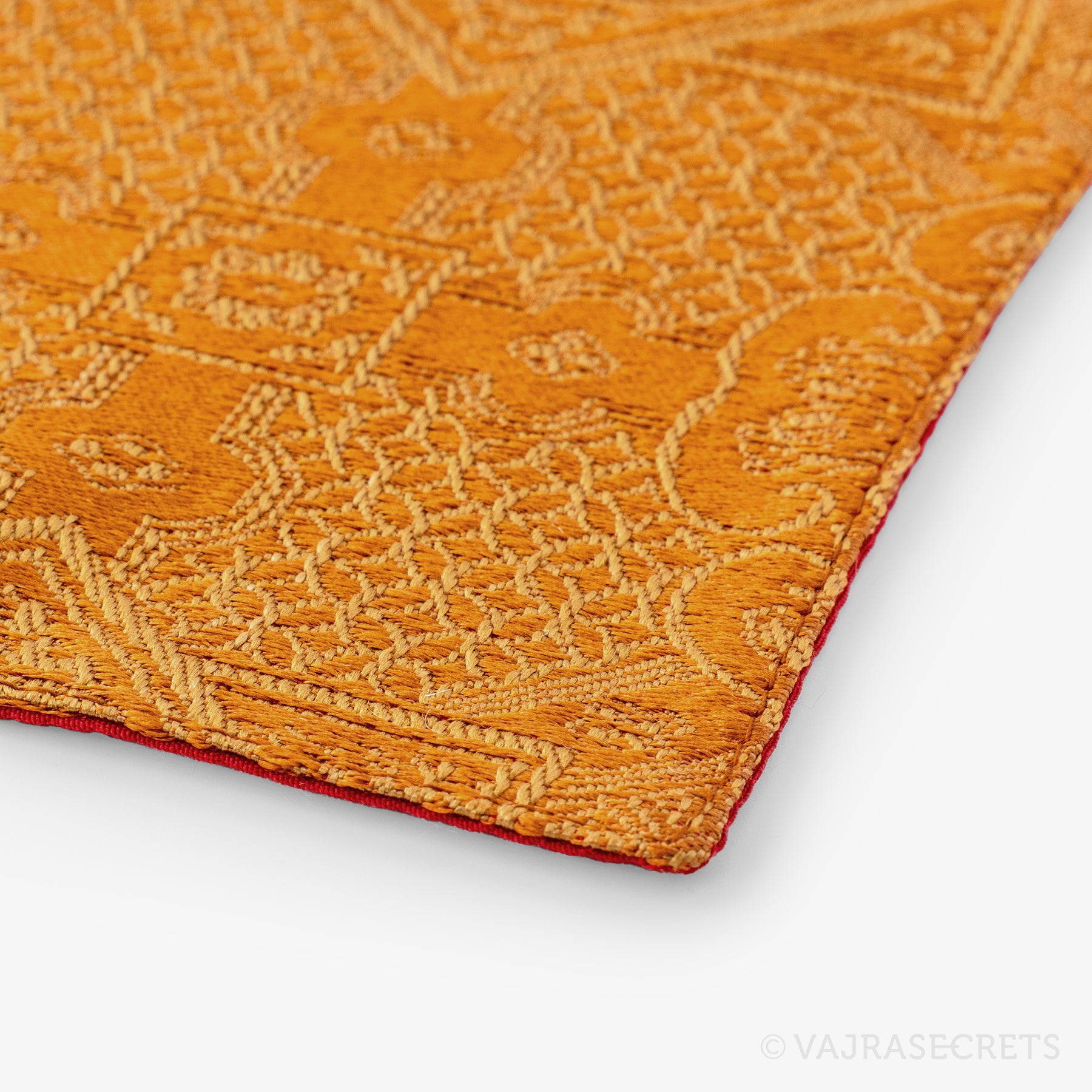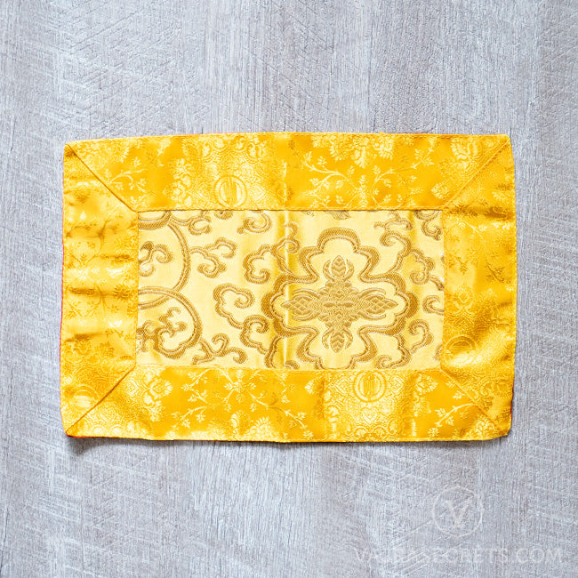 A Tibetan ritual mat to enhance the beauty of your sacred space. Handmade from synthetic silk brocade with traditional motifs, it can be placed in a ritual tray or on your prayer table as a base on which to respectfully place ritual items.
