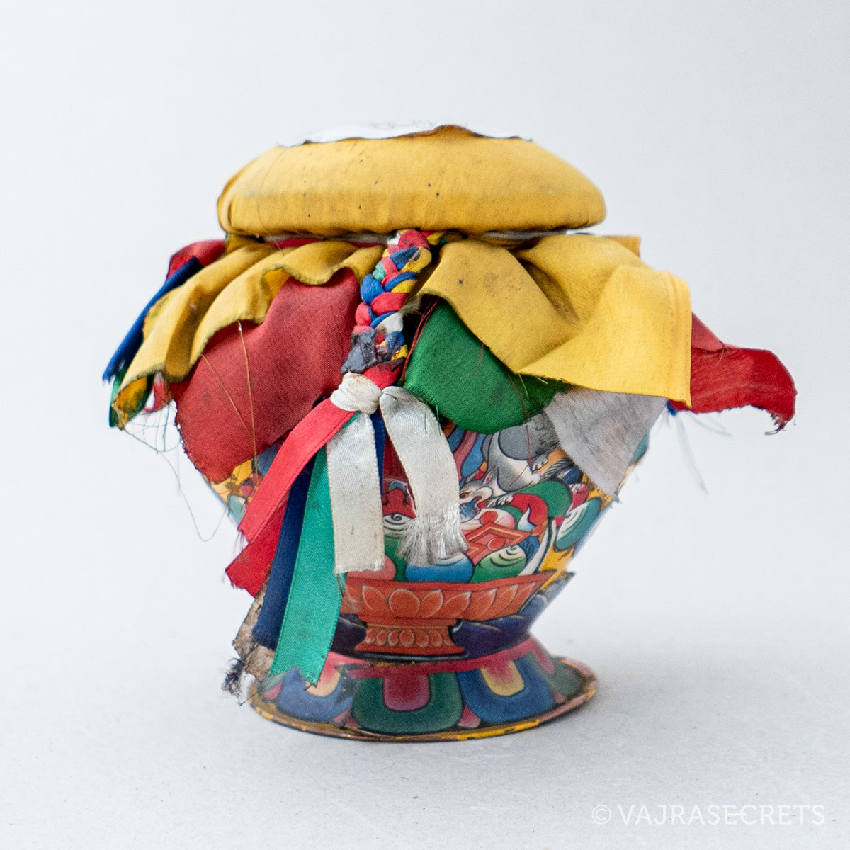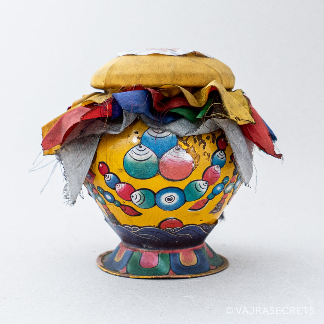 Originating in India, the tradition of wealth vases arrived in Tibet over 1,000 years ago. The ancient Saint Padmasambava gave specific instructions for creating wealth vases, which represent the Wealth Buddhas. Since then, Tibetans have kept wealth vases in their homes, on the altar and even buried in the ground. These days, wealth vases are also kept in offices and places of business.