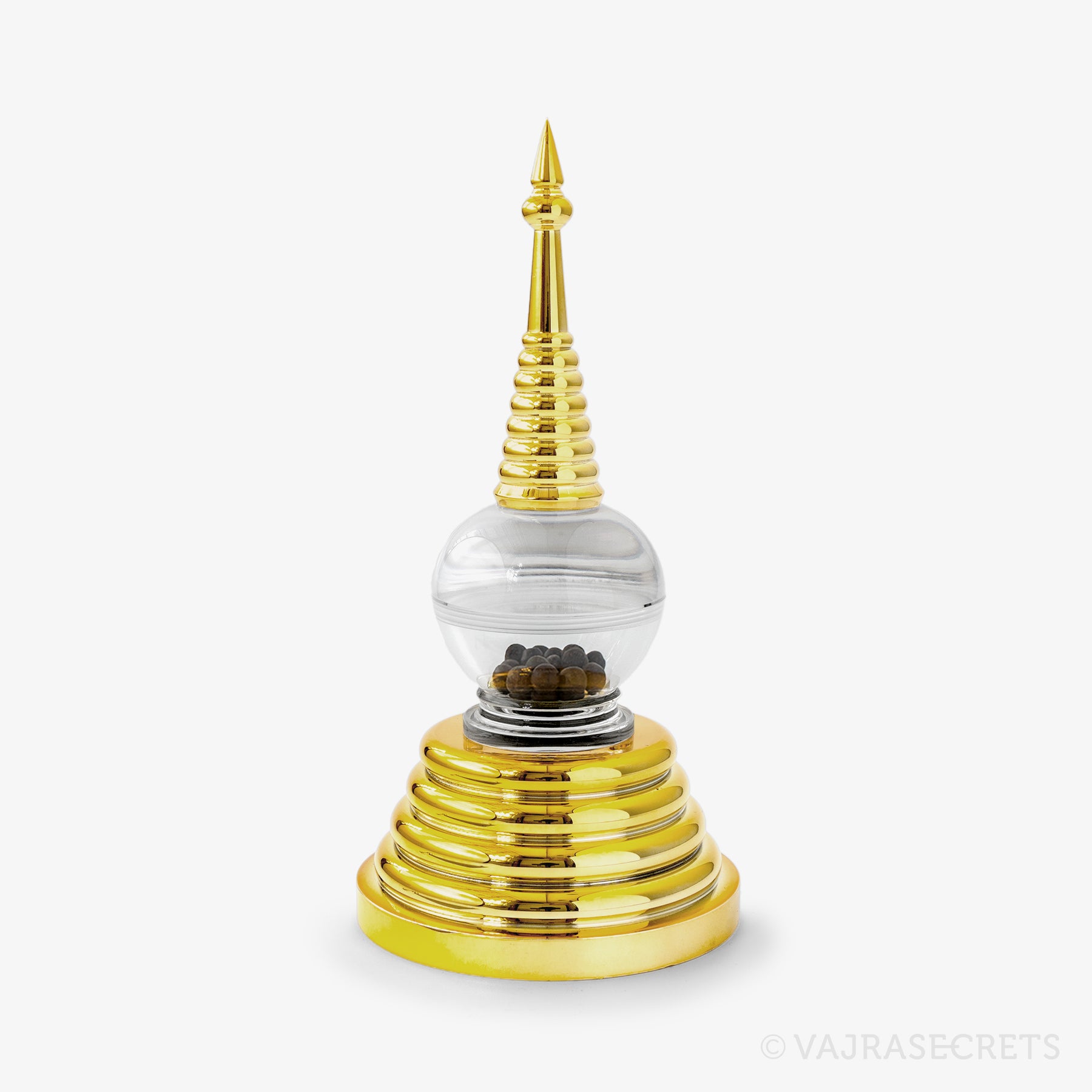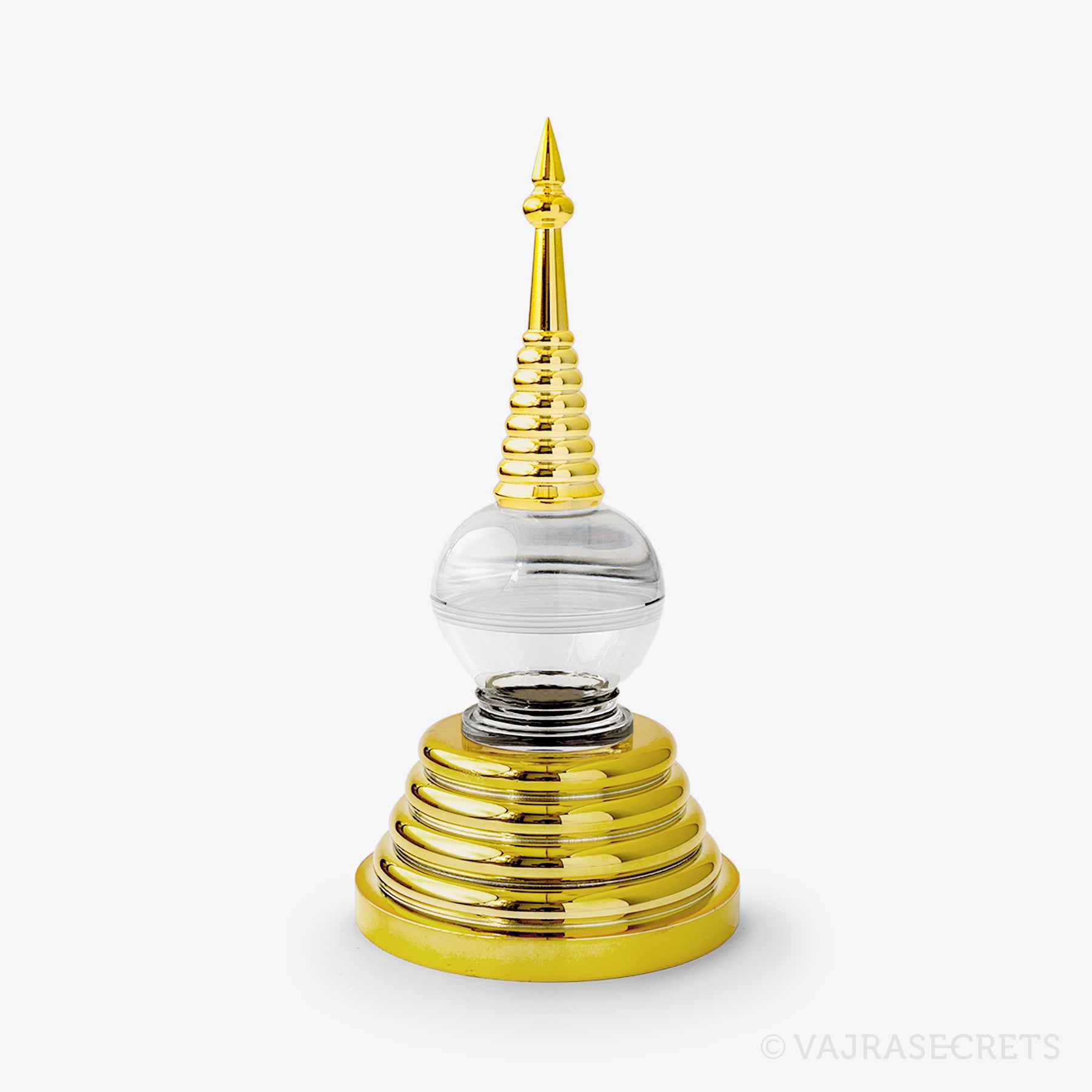 An acrylic stupa with gold finish featuring a screw-on hollow base for insertion of sacred items such as holy pills, precious relics, mantras and other blessed objects. Representing the Buddha’s limitless holy mind, place this stupa on the altar, in the shrine room or meditation area for daily veneration.