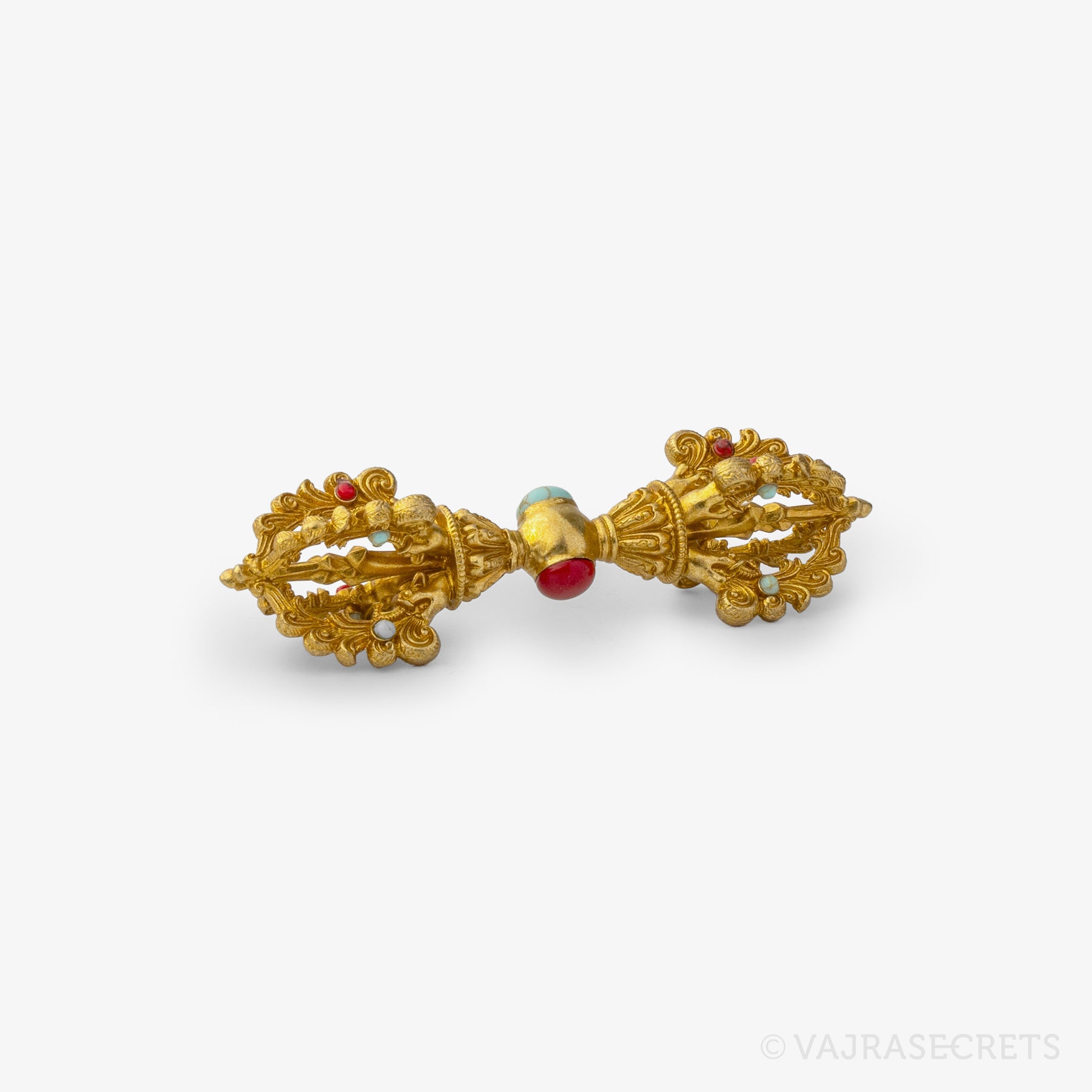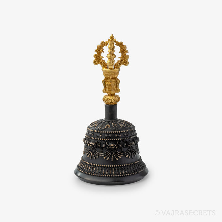 A finely crafted five-pronged vajra and bronze alloy bell, featuring ornate carvings and adorned with faux coral and turquoise stones. Producing a resonant sound that is bright and clear, it is suitable for practitioners who prefer a medium tone and louder volume.