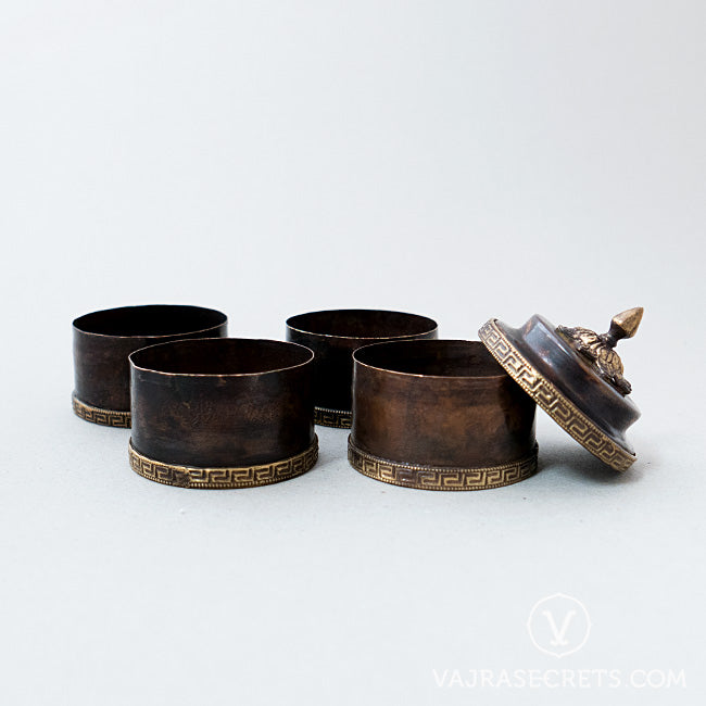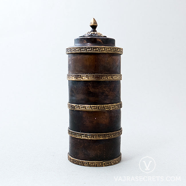 A sleek four-tiered Tibetan Ritual Rice Pot with a vintage antique finish and decorated with Tibetan-inspired motifs. It is used as a vessel for raw rice, barley and other ritual substances required during pujas and ceremonies. Ideal for advanced practitioners who need convenient access to a variety of ritual substances.