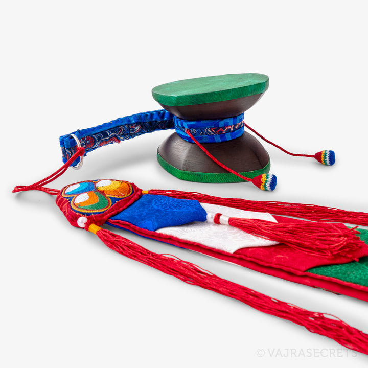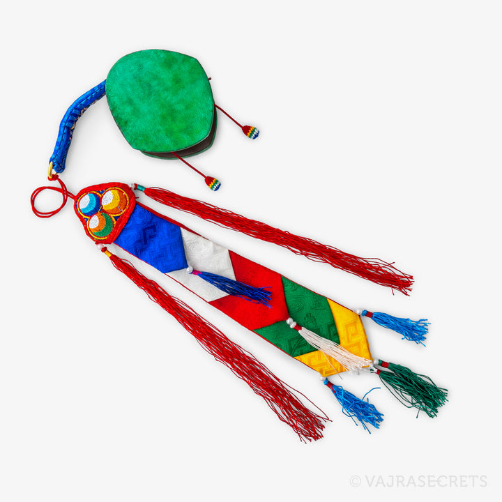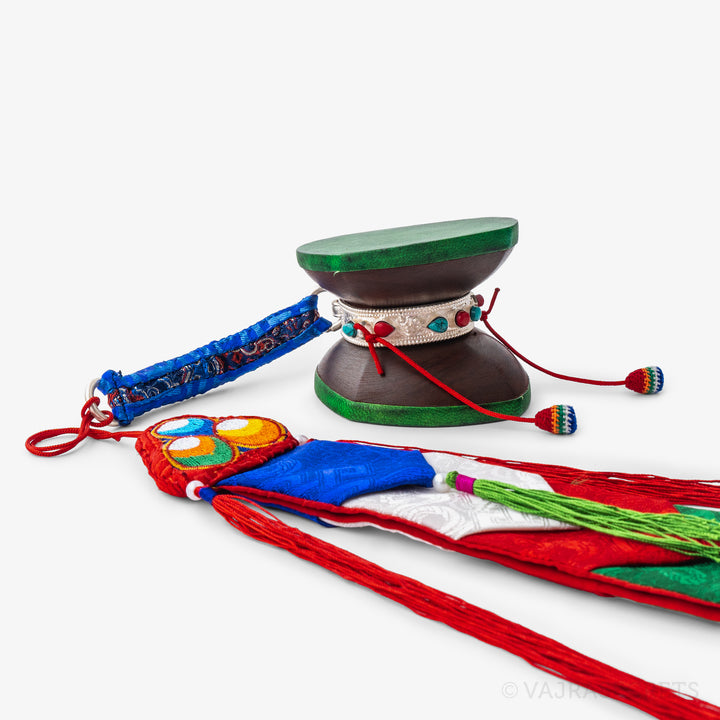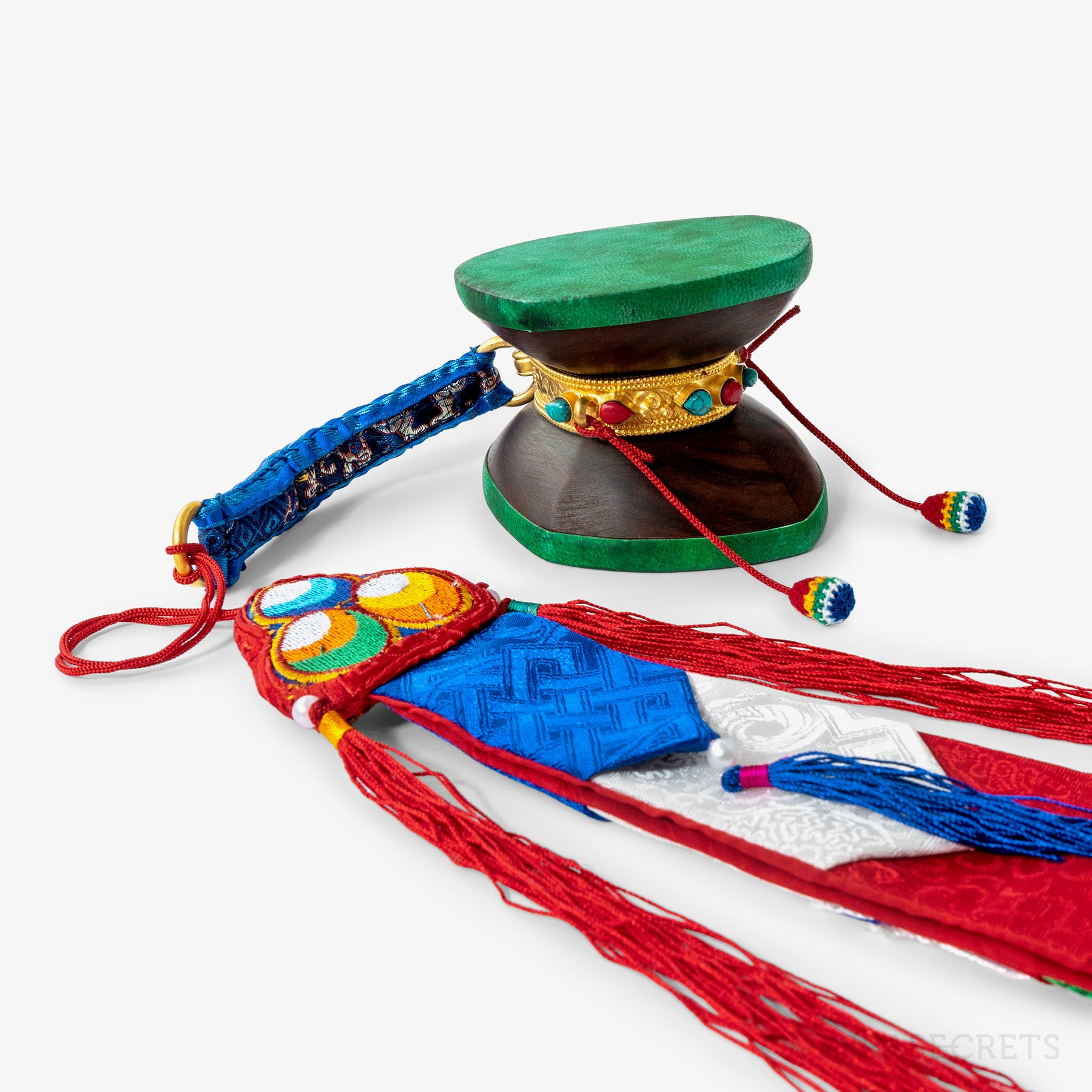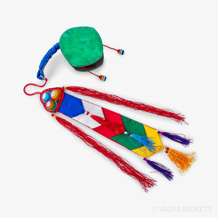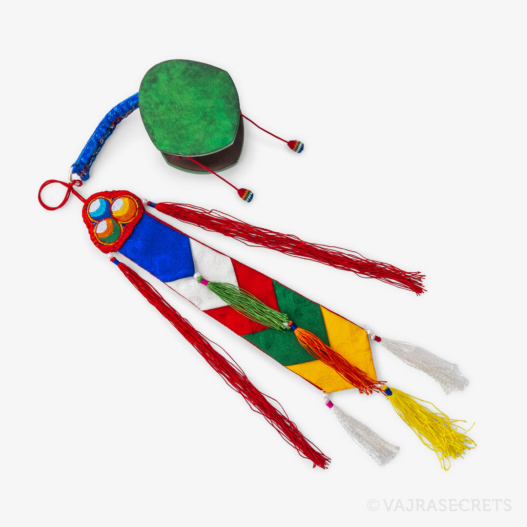 The damaru tail (chopen) is made from five-coloured silks, representing the five Buddha families — Vairochana (white), Amoghasiddhi (green), Amitabha (red), Ratnasambhava (yellow) and Akshobhya (blue).