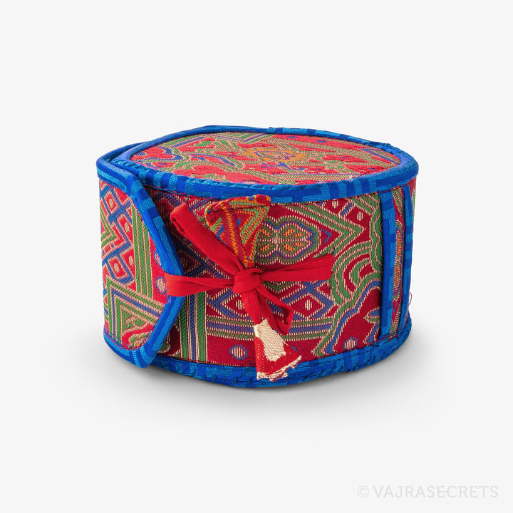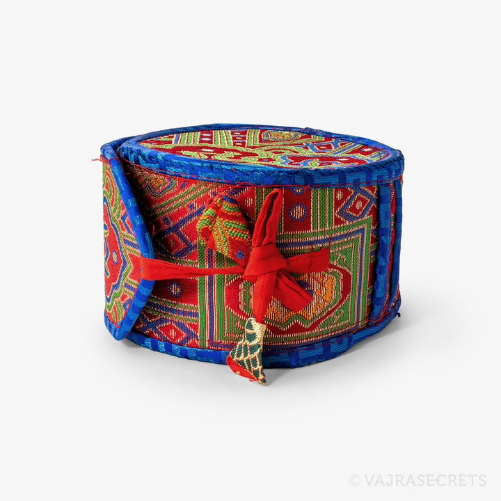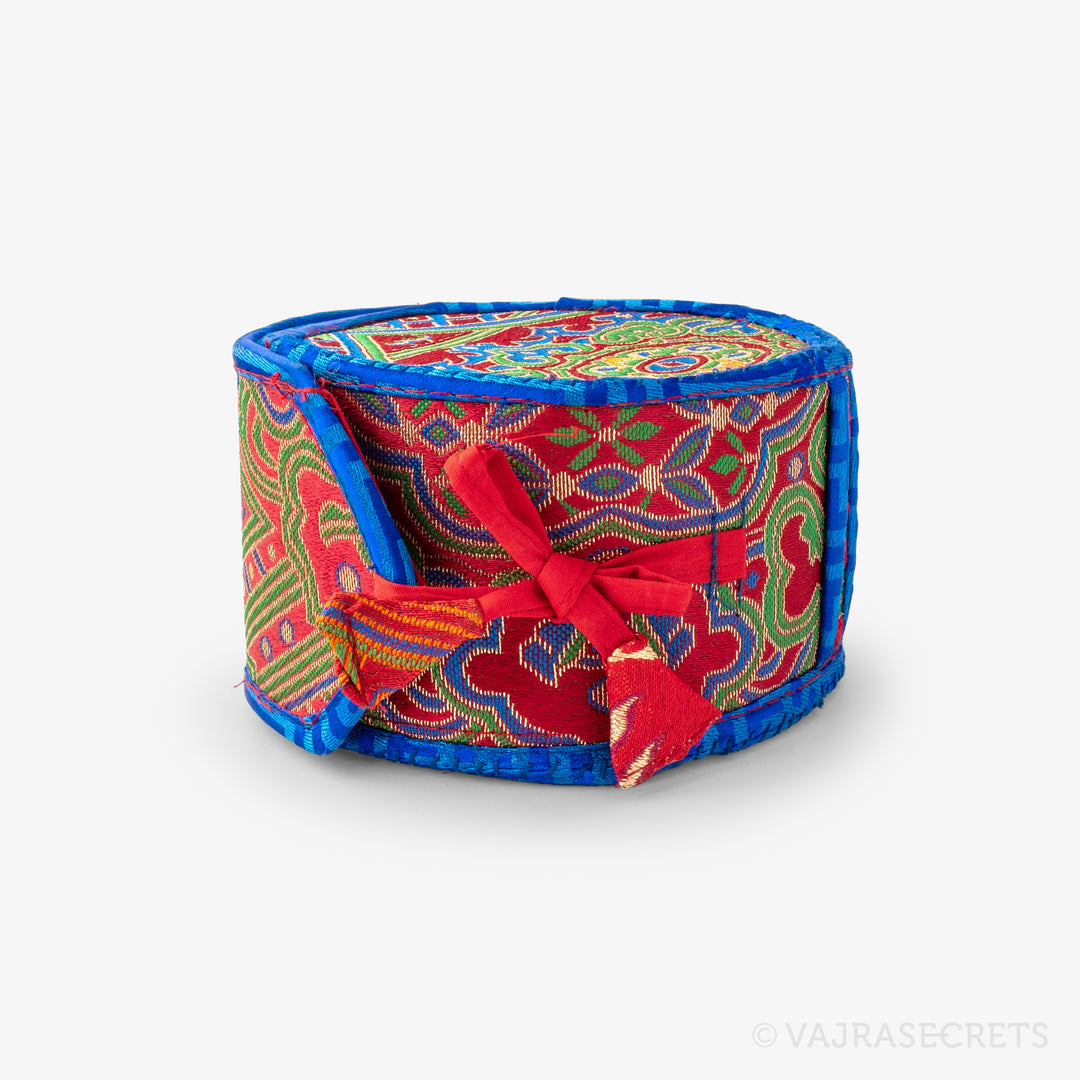 A small damaru (double-sided hand-held drum) handcrafted from polished Himalayan Arnak wood. Available in brocade, silver and gold girdle options.