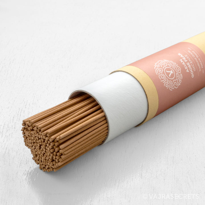 Ultra-slim incense sticks made from traditional grade Asian goose pear fruit and other fragrant woods. The aromatic scent is light and sweet, and creates a calming ambience for relaxation, meditation and stress relief. 100% natural blend with no added perfumes or fragrances.