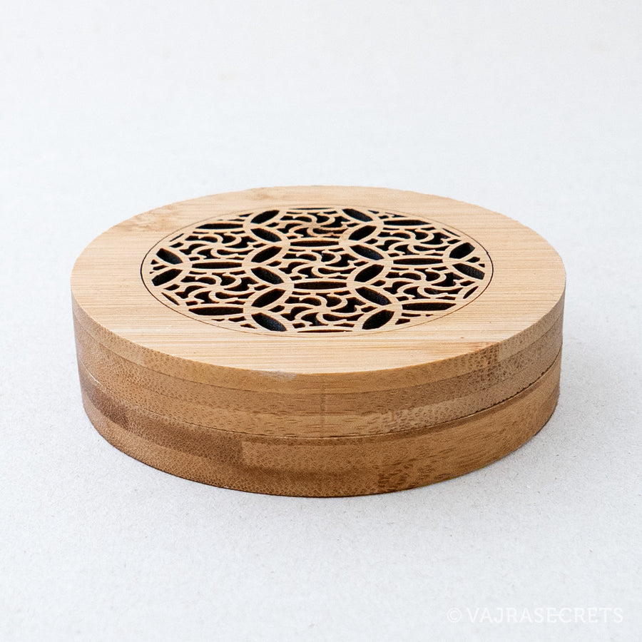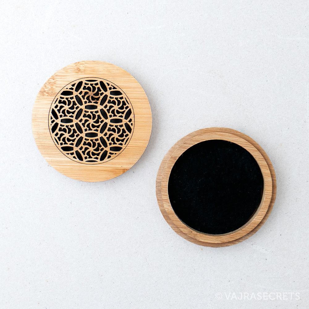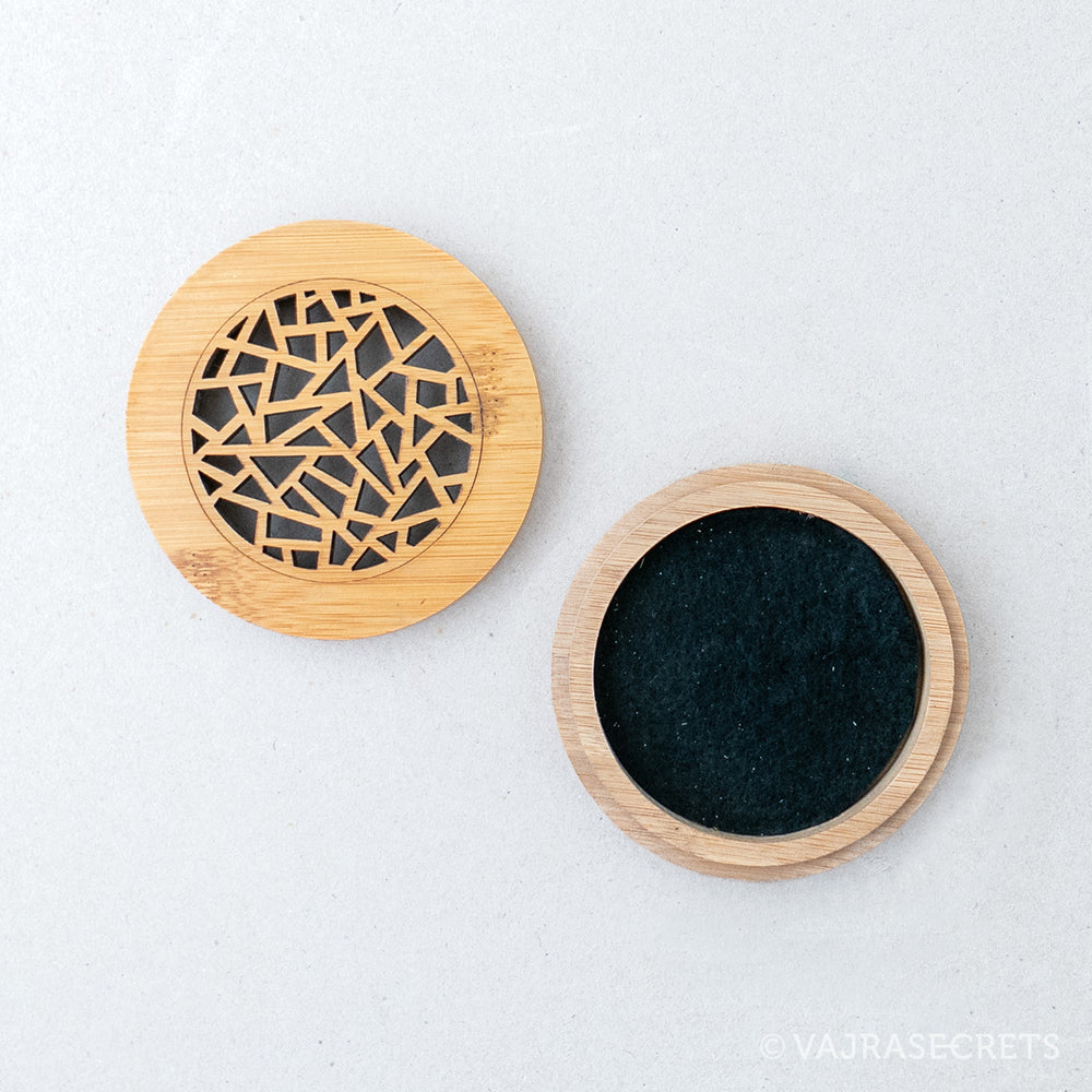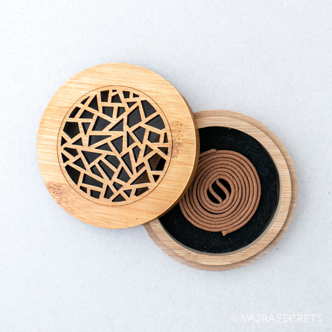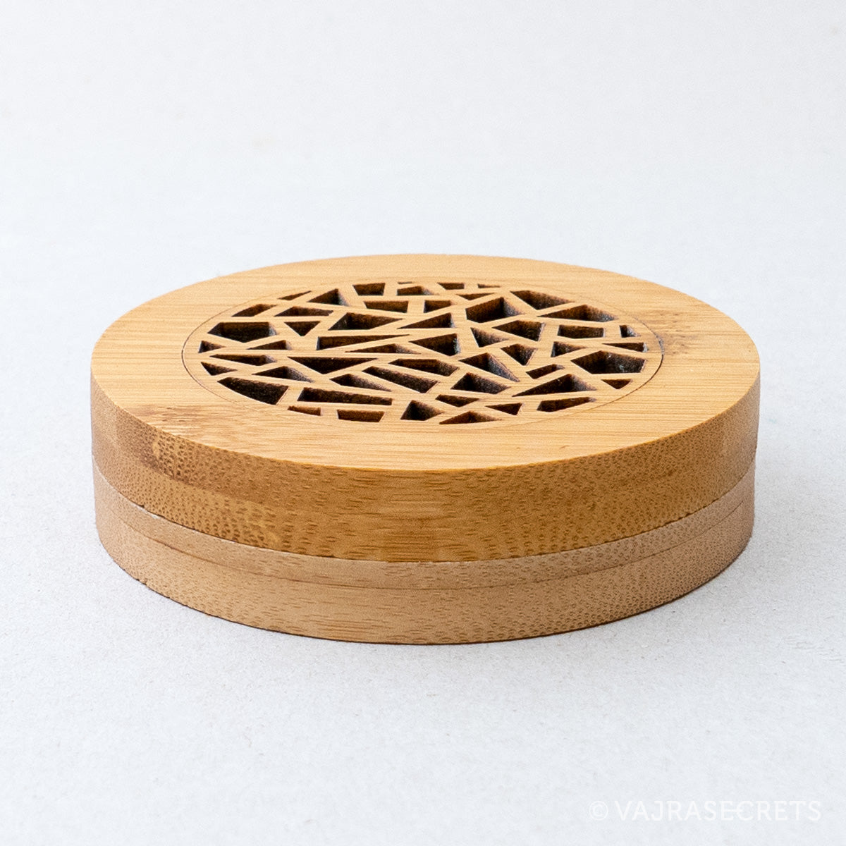 A simple Oriental-inspired incense burner made from sustainable bamboo and featuring a geometric motif on the lid. Lightweight and compact, it is ideal for travelling so you can meditate, make offerings or do space clearing rituals at any place, any time. Also suitable for the office so you can light incense and uplift the energy in your workspace.