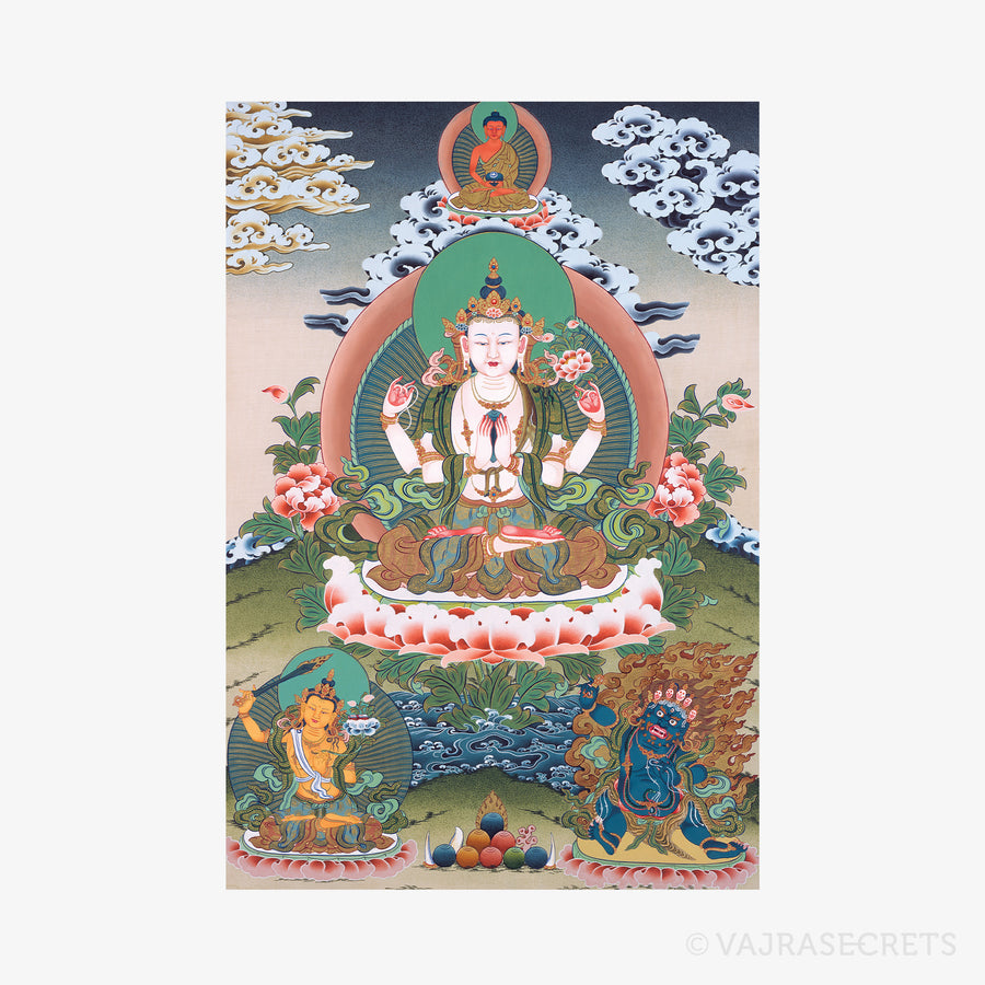 A high-quality thangka print of Chenrezig, the Buddha of Compassion, who is also known as Kuan Yin in Chinese, Avalokiteshvara in Sanskrit and Kwannon in Japanese. He holds Bodhicitta, or altruistic love for all sentient beings closes to his heart. He inspires us to practise real inner transformation of our negative qualities becoming truly beautiful from the inside out.