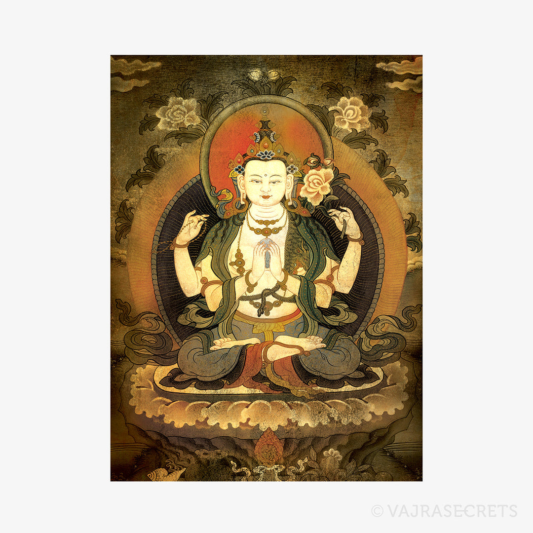 A high-quality, vintage-style thangka print of Chenrezig, the Buddha of Compassion, who is known as Kuan Yin in Chinese, Avalokiteshvara in Sanskrit and Kwannon in Japanese. His image calms the immediate environment, clears negative energy and encourages harmony. He holds Bodhicitta, or altruistic love for all sentient beings closes to his heart. He inspires us to practise real inner transformation of our negative qualities becoming truly beautiful from the inside out.