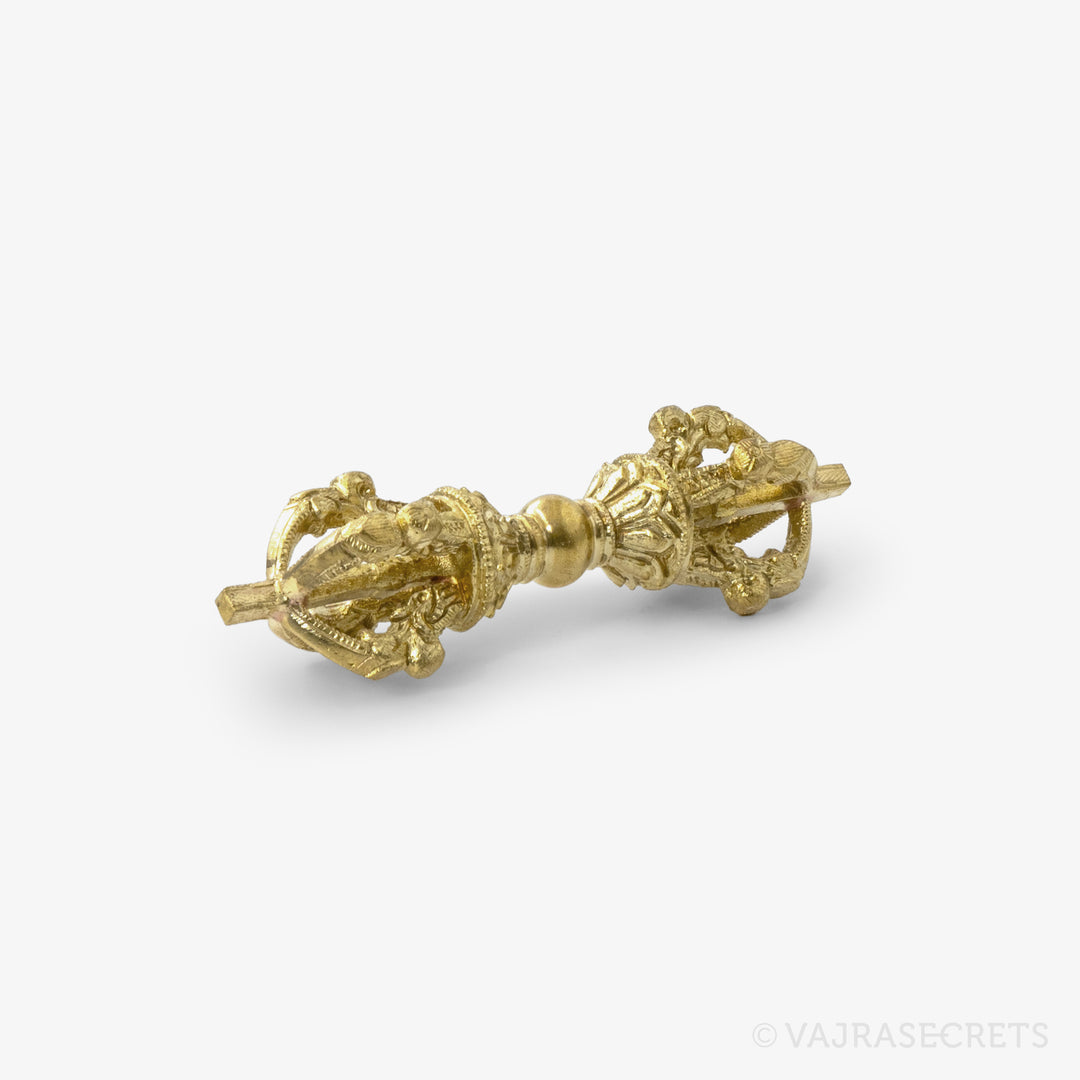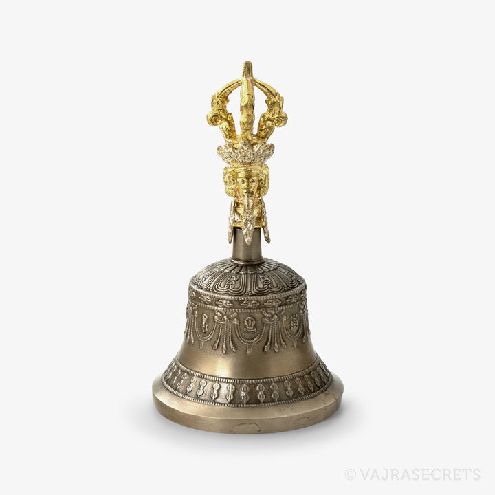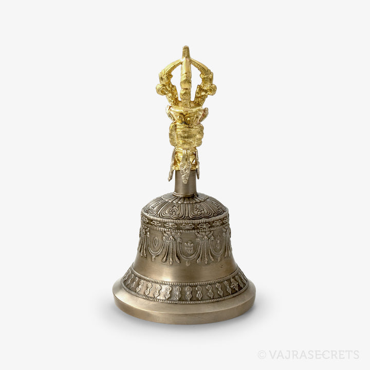 A premium quality five-pronged vajra and bronze alloy bell with a resonant sound that is deep for its size. Handcrafted by the master artisans of Dehradun from their famous 5-metal alloy, it is ideal for practitioners who prefer a richer tone and timbre. Handpicked for excellent ring duration, exquisite sound and craftsmanship.