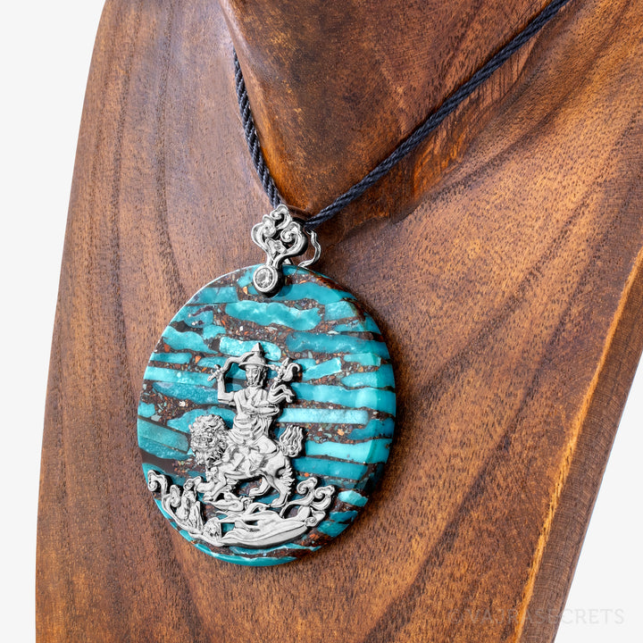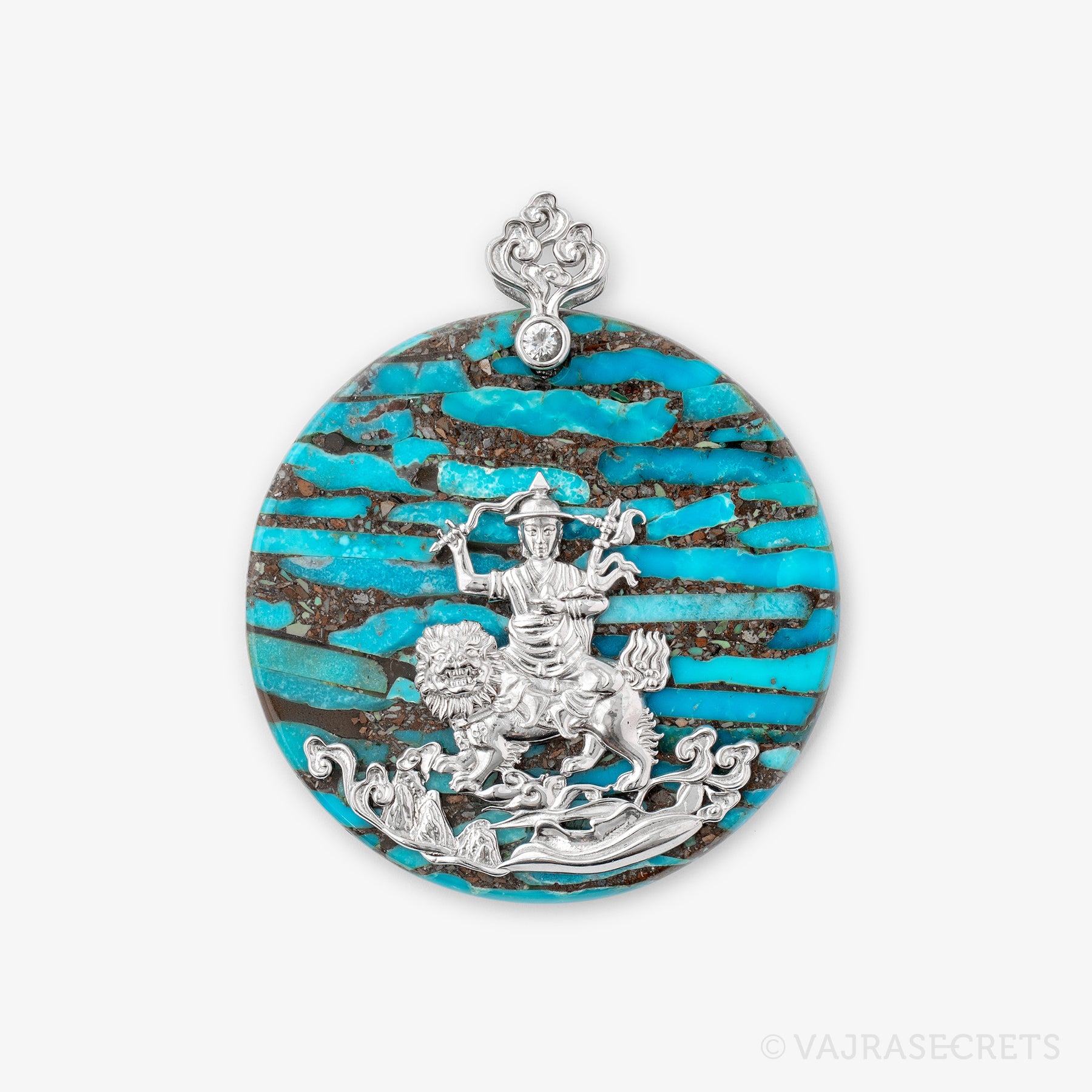 A finely crafted peaceful Dorje Shugden pendant mounted on a turquoise disc and accented with cubic zirconia. Wear him close to your heart and be blessed with protection, healing, positive situations and fulfilled wishes. An eccentric piece suitable for both daily wear and special occasions.
