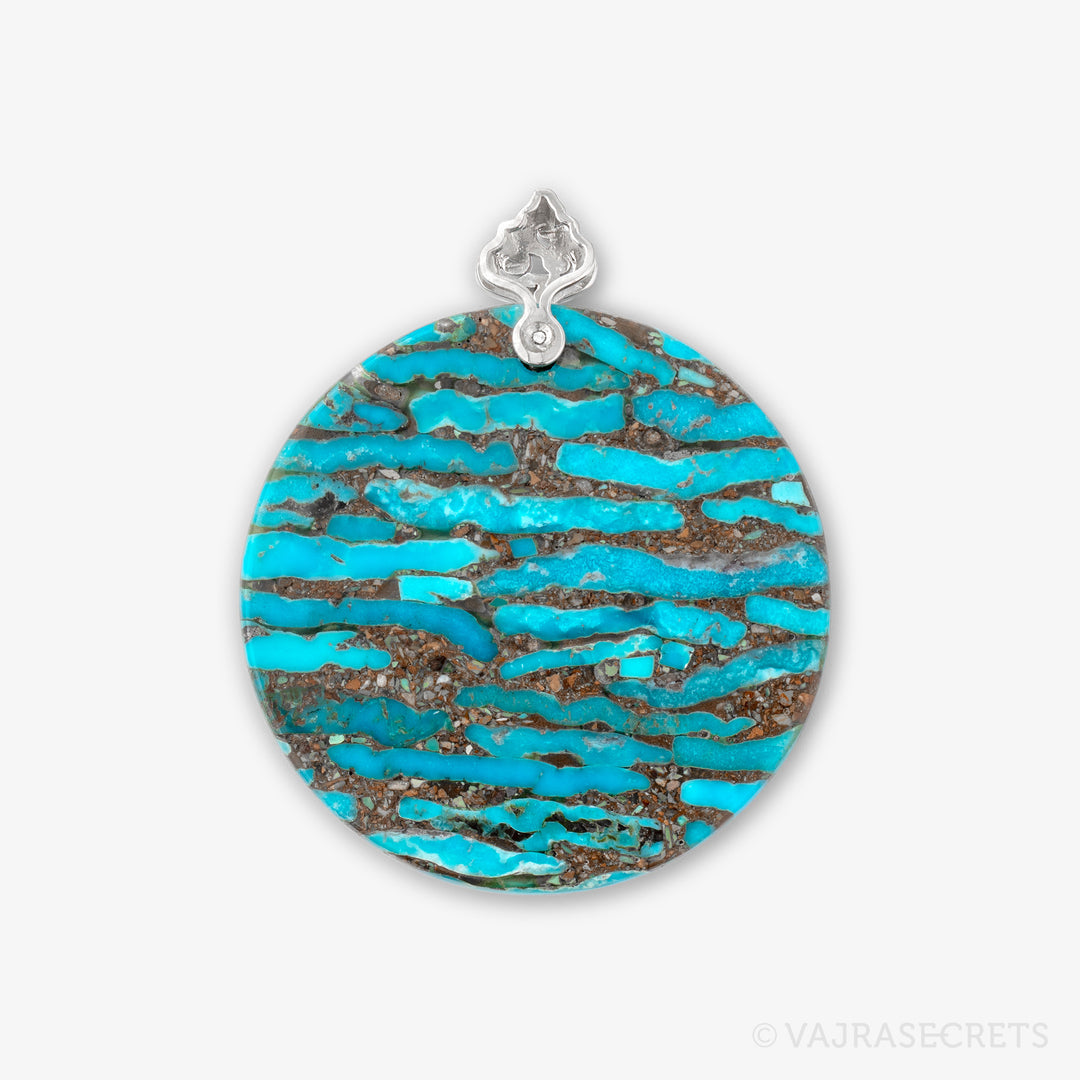 - Mounted on a pressed turquoise disc.