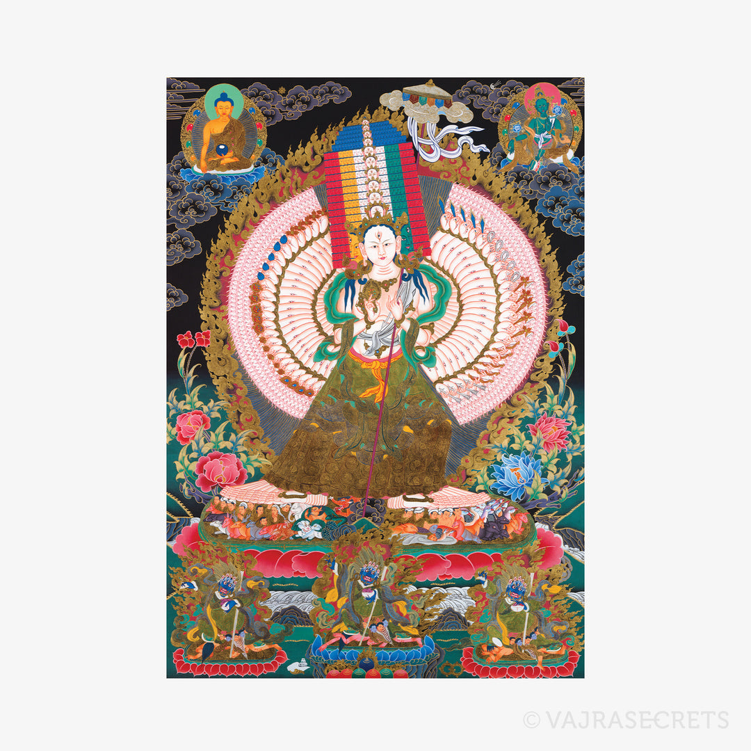 A high-quality thangka print of Dukkar (1000-Armed), also known as White Umbrella or Sitatapatra in Sanskrit., who is very beneficial for healing, over 60 classes of spirits and in legal situations. It is said that prayer to Dukkar fortifies our body so strongly that spirits literally cannot invade.