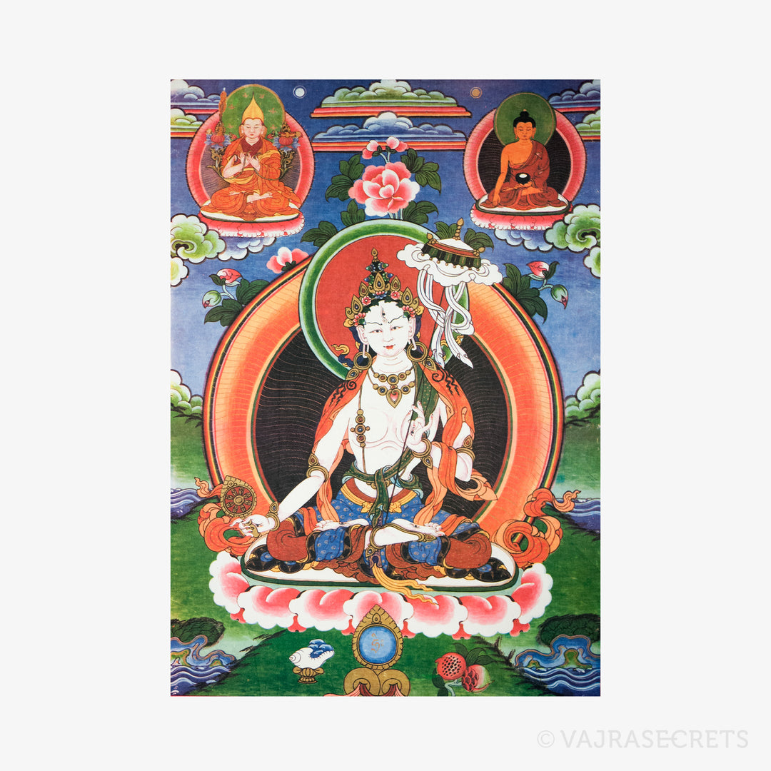 A high-quality thangka print of Dukkar, also known as White Umbrella or Sitatapatra in Sanskrit, who is very beneficial for healing, protection from over 60 classes of spirits and in legal situations. At the top left of the thangka is Lama Tsongkhapa in teaching mudra, who is the emanation of the Buddhas of wisdom. At the top right of the thangka is Buddha Shakyamuni, founder of Buddhism, in the earth-touching mudra.